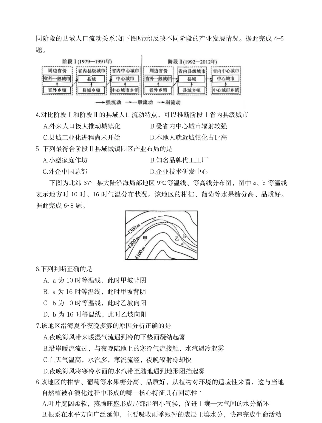 4.D【解析】读图可知,阶段 I 省外人口与县城之间人口流动关系为弱流动,说明外来人口不多, A 错误;县城、县城乡镇与省内中心城市之间人口流动较少和为弱流动关系,说明受省内中心城市辐射较弱, B 错误;县城乡镇与县城之间人口流动关系较强,说明本地人就近城镇化占比高,县城工业化进程已经开始,吸引了大量县城乡镇人口进入县城, C 错误, D 正确。故选 d 。