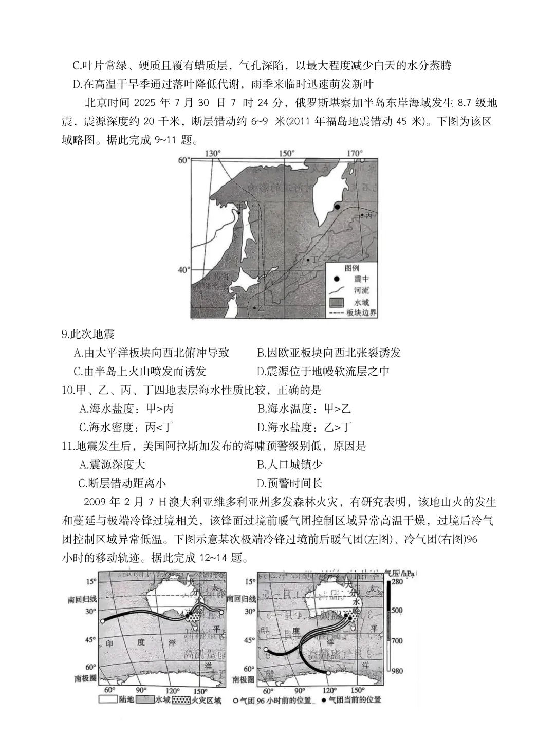 9.A【解析】堪察加半岛东侧为太平洋板块与美洲板块的消亡边界,太平洋板块(乙所属板块)向西北俯冲至美洲板块下方,引发强烈地震, a 正确;堪察加半岛非张裂带,且其所在板块为美洲板块, B 错误;是板块运动诱发地震,而不是半岛上火山喷发诱发地震, C 错误;据材料可知,地震的震源深度为20千米,软流层深度普遍>80千米, D 错误。故选 A 。