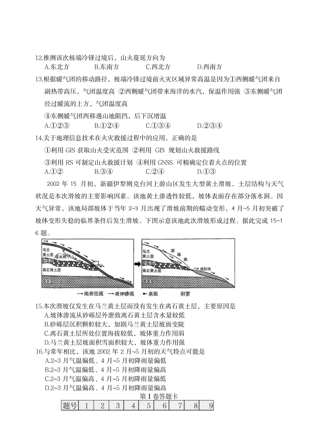 16.D【解析】根据所学知识可知,伊犁为温带大陆性气候,降雨主要集中在夏季,冬季多降雪,春季气温回升快,多季节性积雪融水:结合材料信息"当年2-3月出现了滑坡前期的蠕动变形,4月~5月初突破了坡体变形失稳的临界条件后发生滑坡"可知,2~3、月气温偏高融雪量增加,渗流增加,但土壤含水量仍未达到失稳临界条件,所以促使坡体蠕动变形,4月~5月初降雨量增加,降水偏多,渗流加大,促使突破失稳临界,出现滑坡, d 正确, a 、 b 、 c 错误。故选 d 。