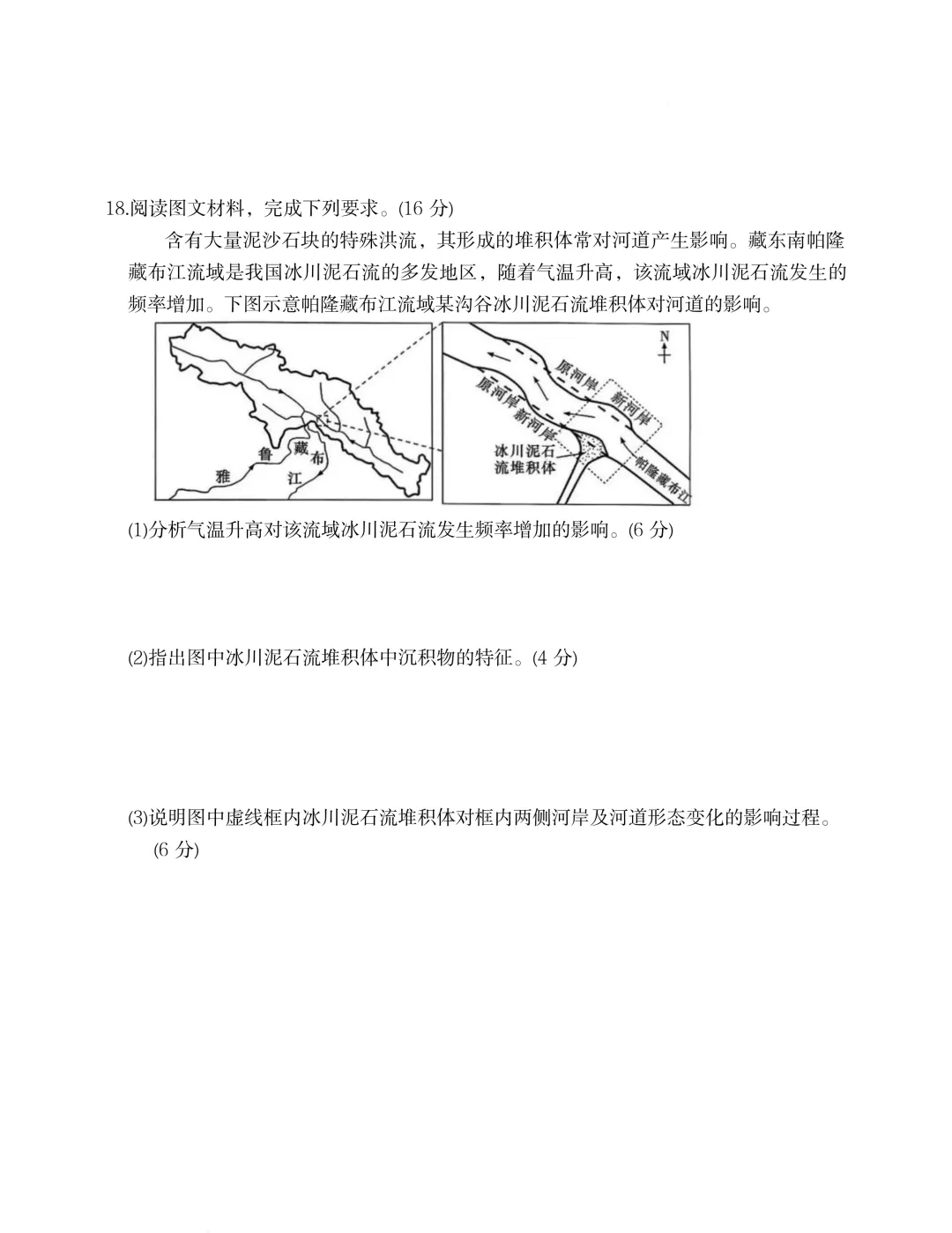 (3)冰川堆积在左(南)岸堆积形成凸岸;(2分)河道变窄、河水变深,主河道向(北)岸靠近;(2分)流速加快,