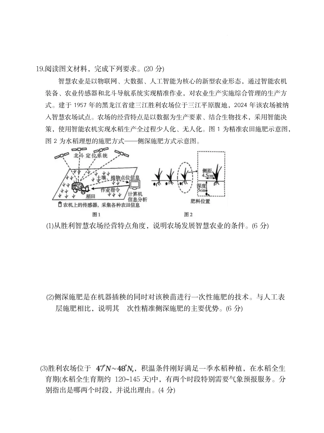 (2)把肥料施到秧苗根部附近,利于根系缓慢吸收而不流失(利用效率高);(2分)减少肥料用量(或减少浪费);(2分)精准均匀施肥(不漏施也不多施),利于增产;(2分)减少农田污染;(2分)一次作业完成,节约成本(或降低人缸成本)。(2分)(答对3点得6分)