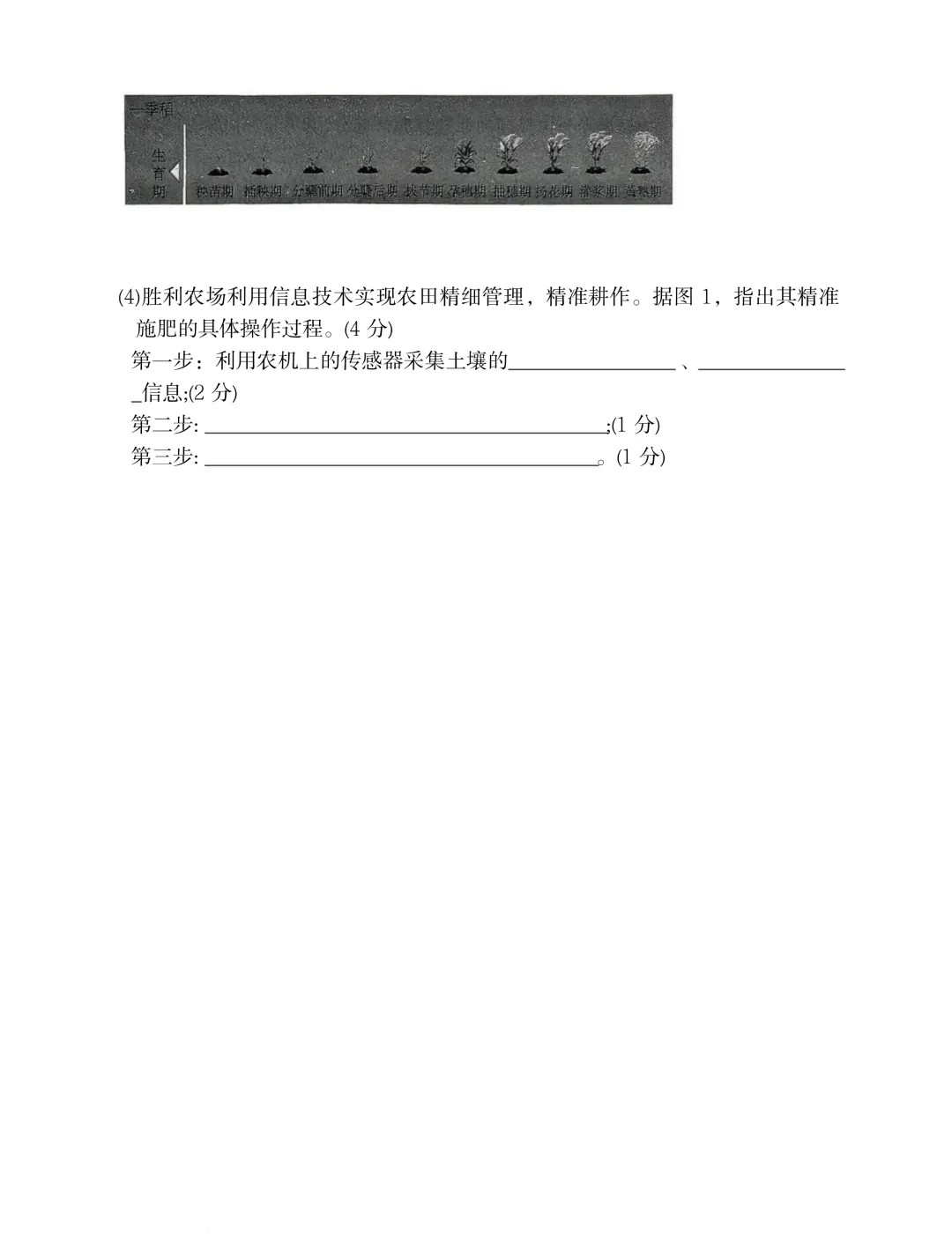 (4)有机质(1分)矿物质(营养盐)(1分)利用计算机系统对采样点进行分析,提出施肥措施(决策方案)(1分)在北斗卫星引导下,对稻田实施按点精准施肥(变量施肥)1分)
