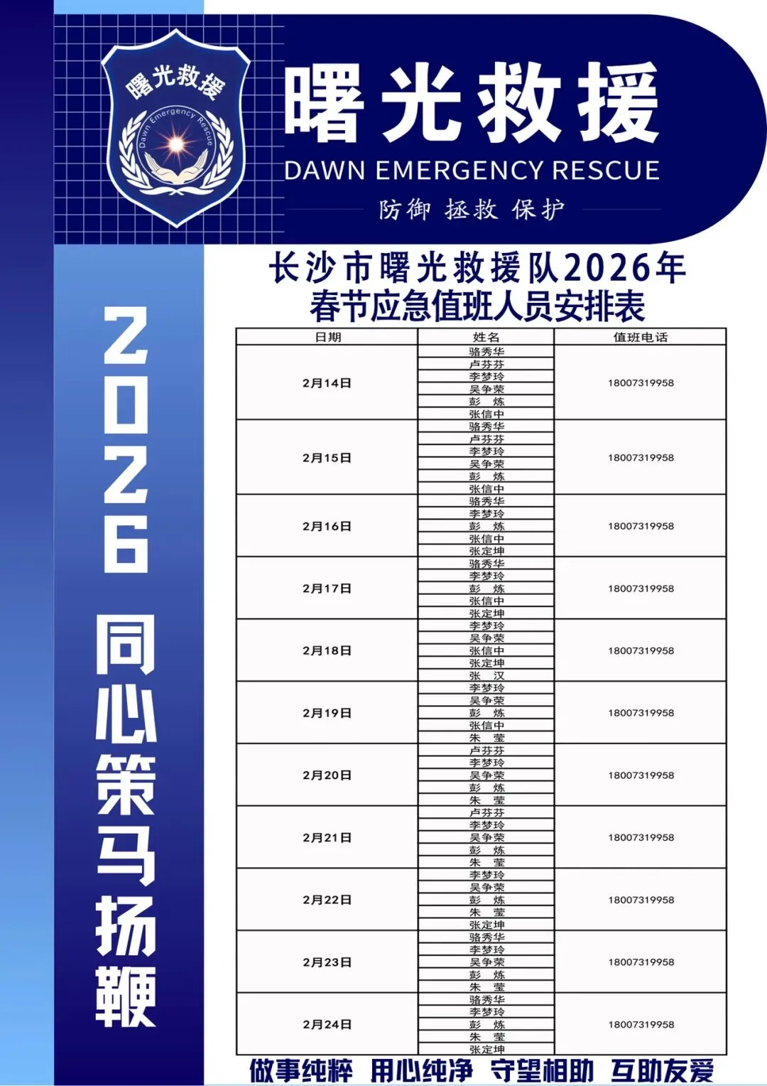 2026年春节将至,为坚决贯彻落实主管部门工作部署,全力配合相关部门高效处置春节假期各类突发事件与群众求助,快速高效开展应急救援,切实保障人民群众生命财产安全,确保各族群众度过平安、欢乐、祥和的新春佳节,长沙市(雨花)曙光救援队即日起启动2026年春节应急备勤值守,值守时段为2026年2月14日至2月24日。