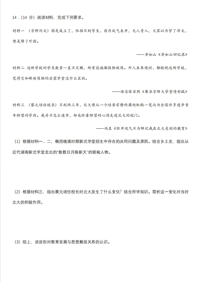 先快速浏览三则材料及设问,明确每问的考查方向——(1)晚清新式学堂招生困境及原因+乡土史人物;(2)蔡元培改革北大的变化及作用;(3)教育发展与思想解放的关系。答题时务必做到“材料依据+知识迁移+逻辑清晰”。