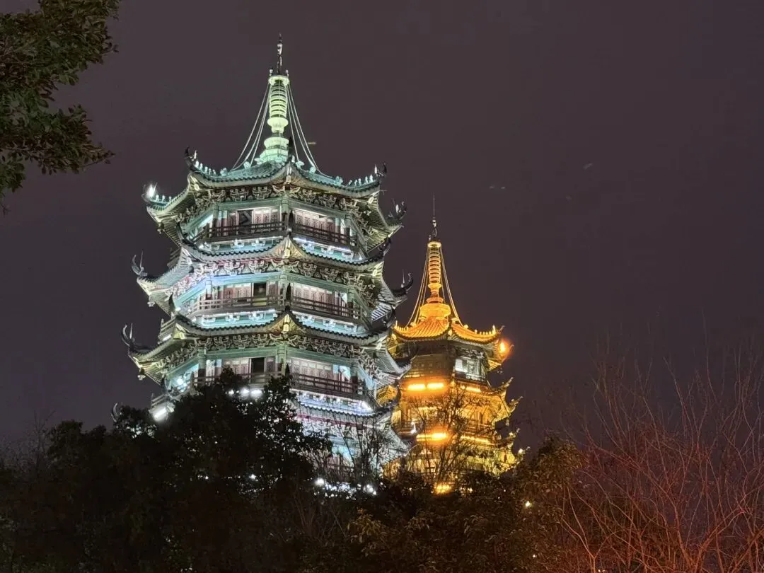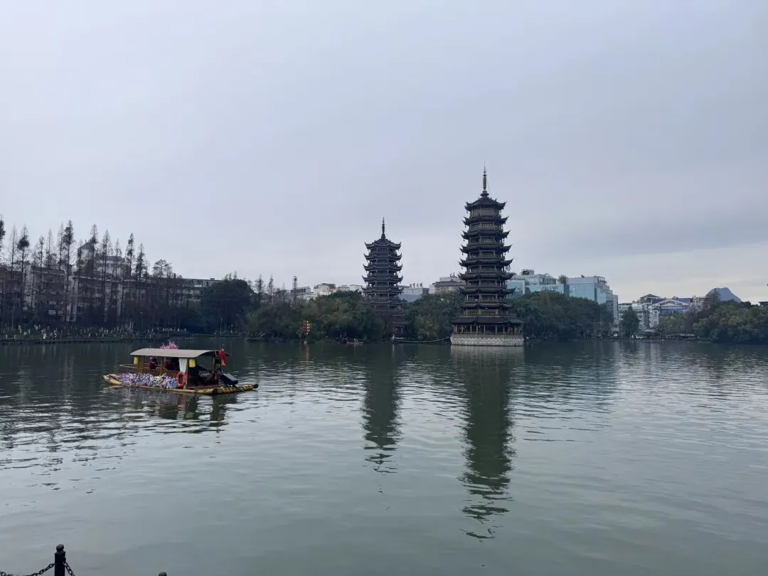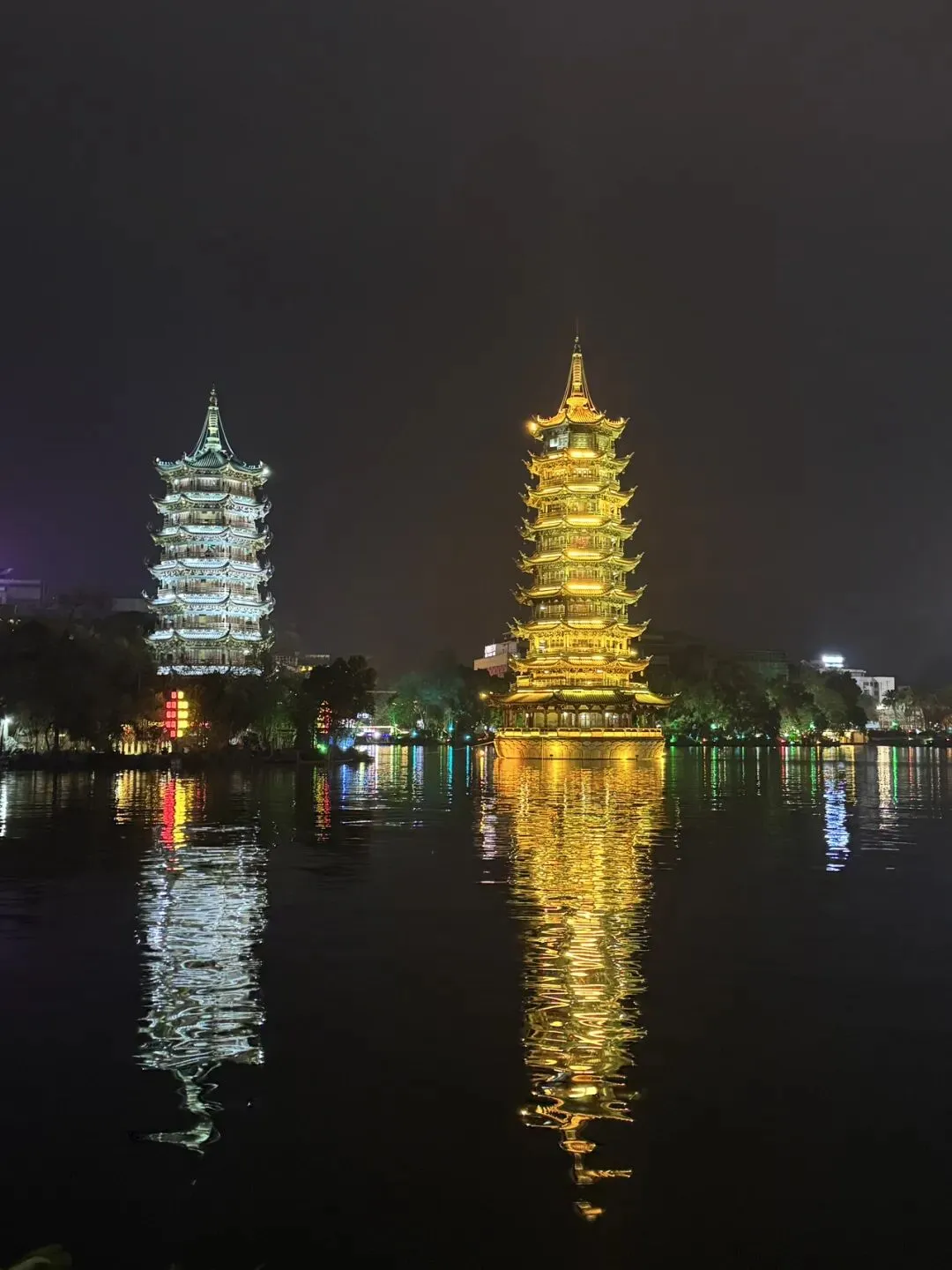 靖江王府,也是广西师范大学,建筑别有特色,门票有点小贵,孩子们也不感兴趣,打卡一走一过哥哥外教推荐的溶洞,西游记水晶宫拍摄地,奶奶第一次去溶洞,雪山倒影是最漂亮的,大自然的鬼斧神工,眼睛才能看到的美,洞里恒温18度,真是冬暖夏凉,古人也会找地方,那时候都没有电,举着火把下溶洞还是挺吓人的吧。这边还有七星岩,冠岩,银子岩,全凭想象,走一个大家一致同意,继续向南自驾。桂林的行程比较松散,晚上无事又去打卡了日月双塔夜景,天气还是阴雨绵绵,没有兴致坐船游两江四湖了。原计划柳州去跟朋友汇合,然后南宁,崇左,防城港,北海,计划不如变化快。全是阴雨天气阴冷,实在让人不舒服,临时决定向广东开,冬天就是为了追太阳,享受温暖的。朋友一家也准备改道去珠海了,我们北海的行程已定,准备向南去阳江,走茂名湛江到北海与另一波朋友汇合。开车就这点好,自由。