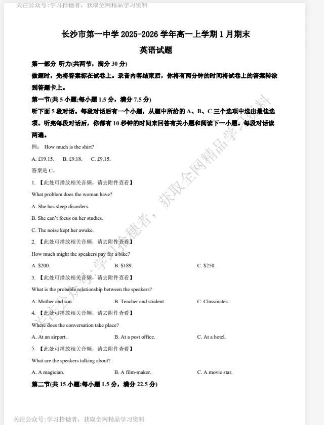 湖南省长沙市第一中学2025-2026学年高三上学期2月期末试题和答案下载