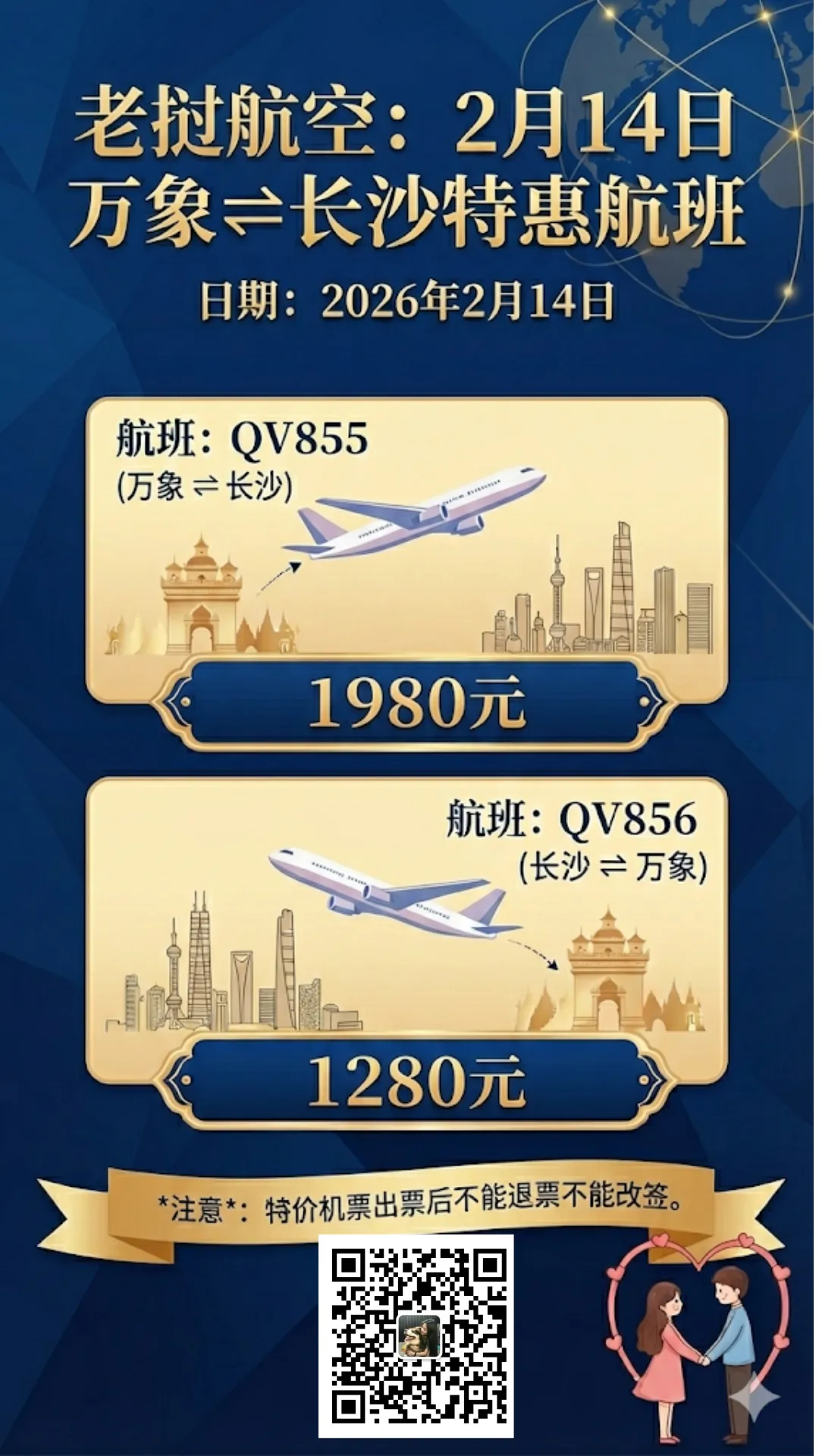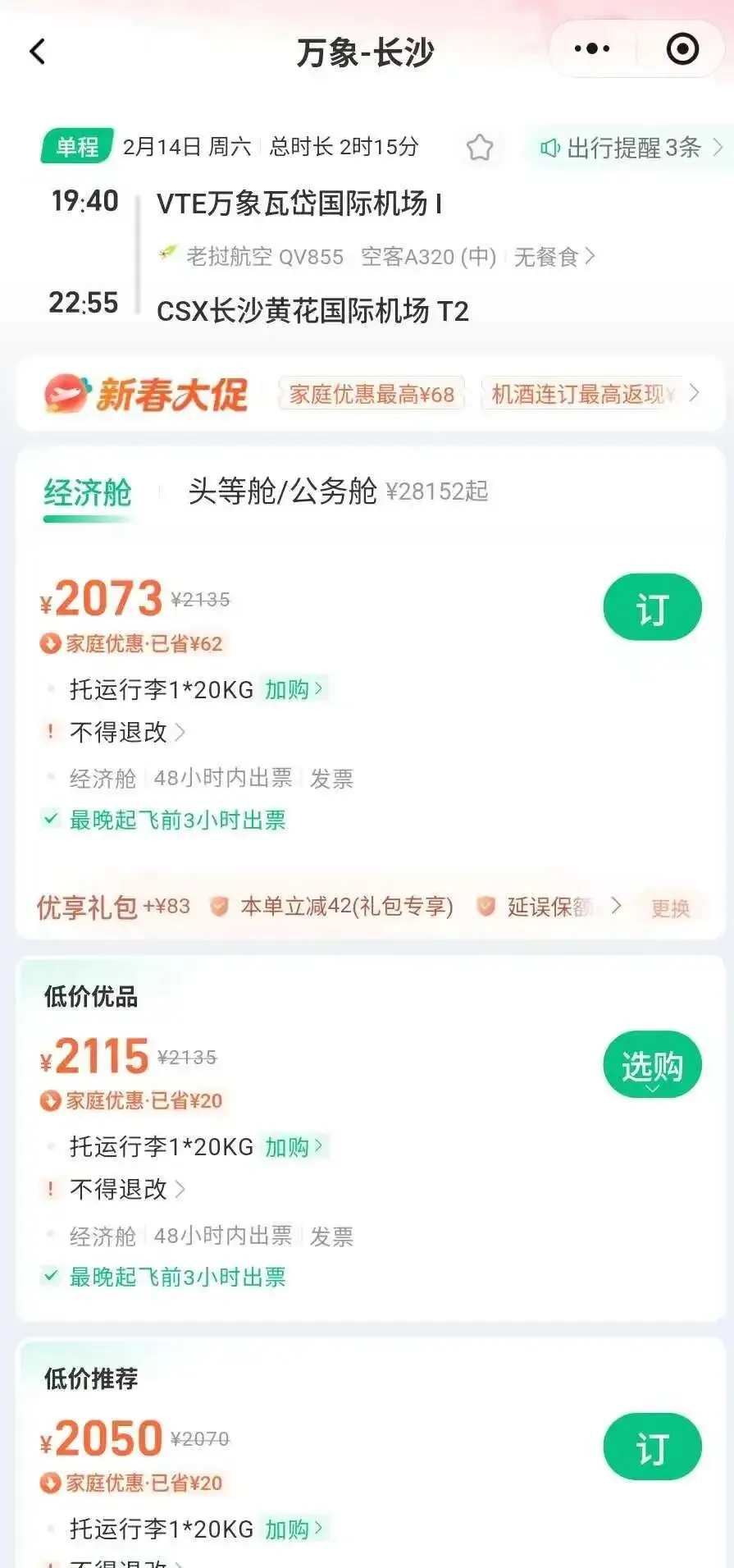 老挝航空万象-长沙春节特别加班,2月14日还有一班