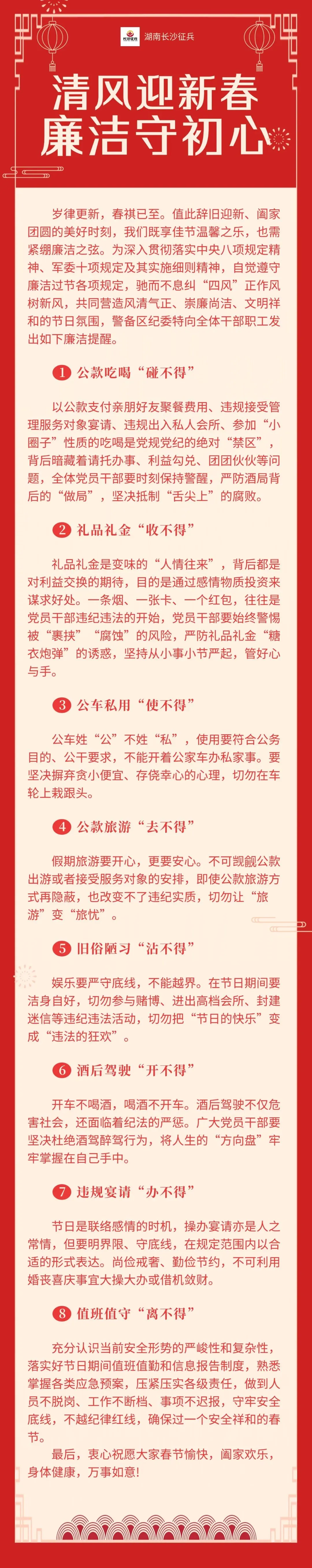 >“清风迎新春 廉洁守初心”——致长沙警备区全体干部职工廉洁过节提醒