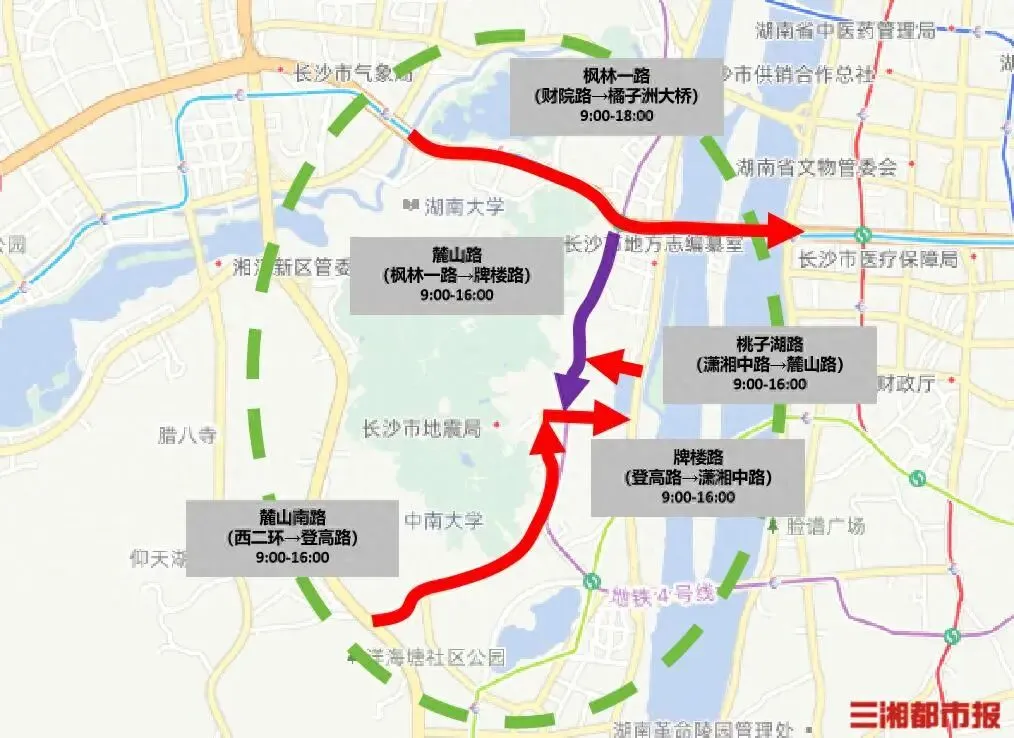 2月17日至2月23日,随着外地游客数量逐步增加,橘子洲—岳麓山景区周边道路拥堵将明显上升。预计每日9时至18时,景区周边的橘子洲大桥、麓山南路、桃子湖路、牌楼路将出现不同程度交通拥堵。
