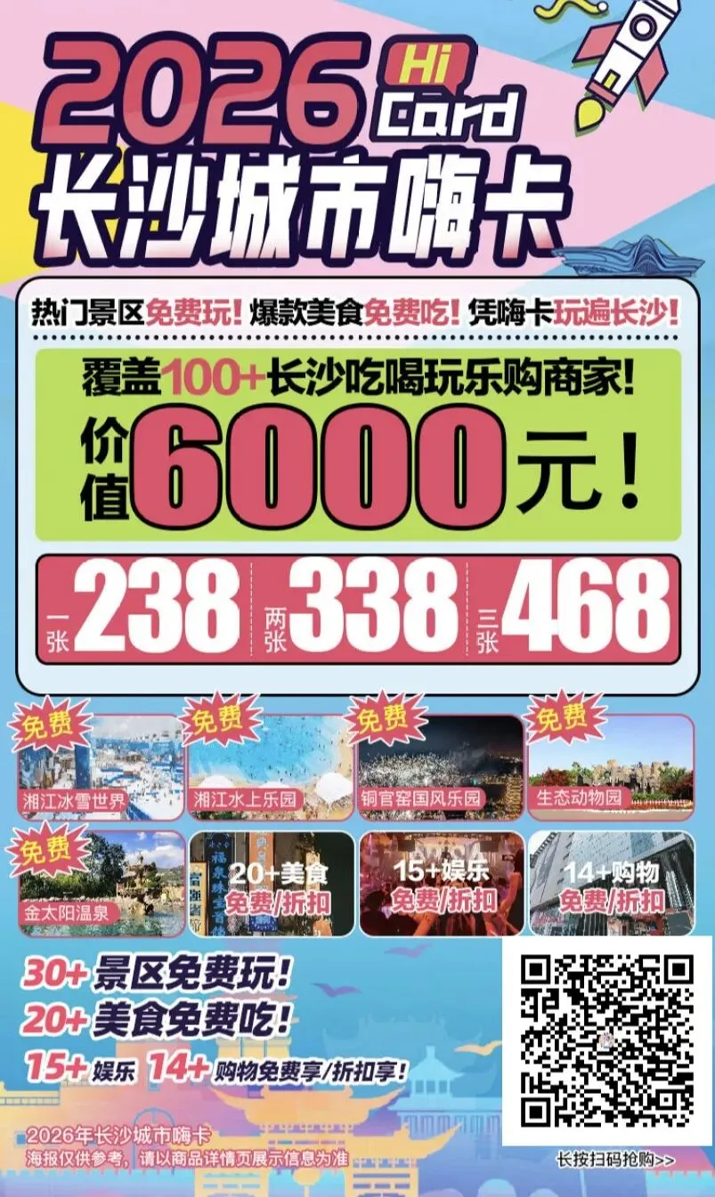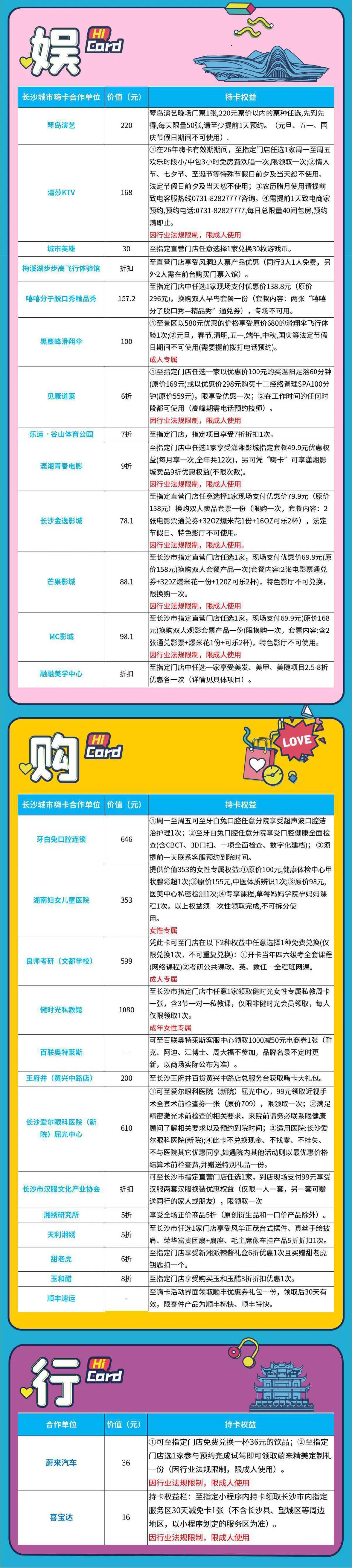 一张”长沙城市嗨卡“包含“吃、行、游、购、娱“5大要素,可享受价值超6000元+的权益覆盖长沙超100+明星商家专享优惠,并且随着品牌商家的不断增加将来可以带来种种不同惊喜。)