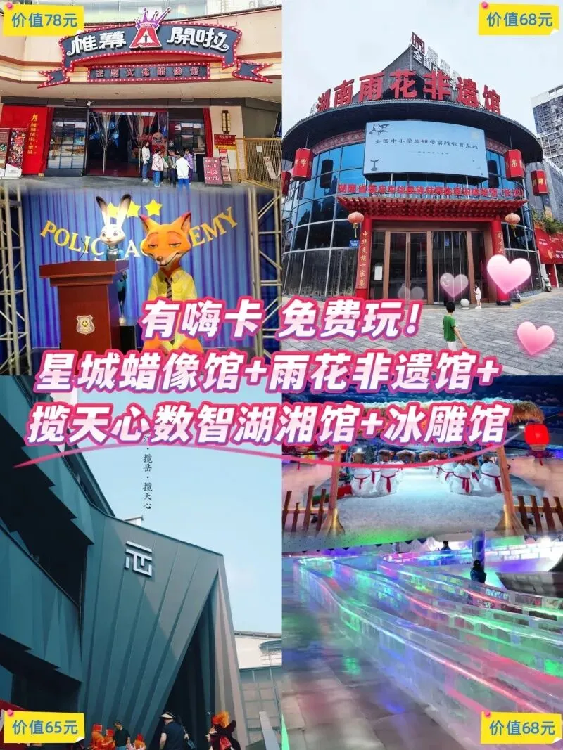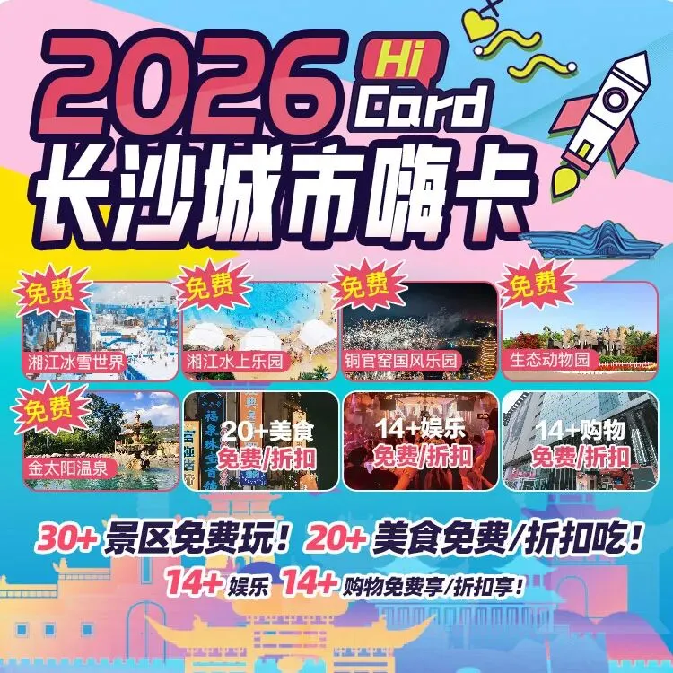 【核销入园】请至少提前1天查看场馆规划出行(有的场馆需预约),进入嗨卡长沙游CS公众号菜单栏点“城市嗨卡”进首页选择26版嗨卡,点“入园”即有入园核销二维码。