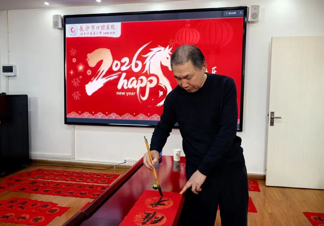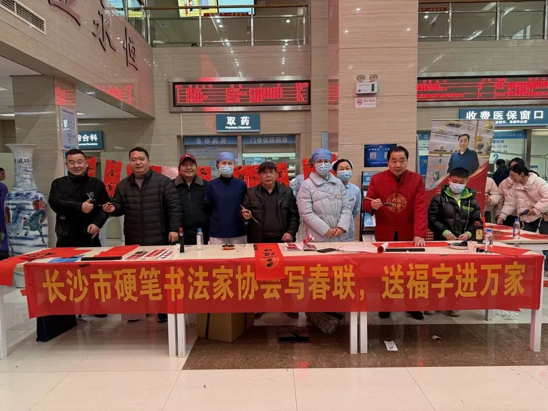 新春将至,年味渐浓。2月9日,长沙市硬笔书法家协会“写春联送福进万家” 文化惠民活动走进长沙市口腔医院,以笔墨传温情,为医护人员送上新春祝福。 活动现场,红纸铺展,墨香四溢。长沙市硬笔书协主席许国章及龙宏毅、李曙曦、周飞、许国华、夏志文等现场挥毫泼墨,笔走龙蛇、各显风采。一幅幅寓意吉祥的春联、一个个饱满喜庆的“福”字接连呈现,将传统文化与新春祝福融为一体。医护人员驻足欣赏、有序领取,手中捧着带着墨香的春联与福字,脸上洋溢着喜悦笑容。 此次活动不仅营造了欢乐祥和的节日氛围,更以文艺志愿服务致敬一线医护工作者,让传统文化在新春时节焕发光彩。