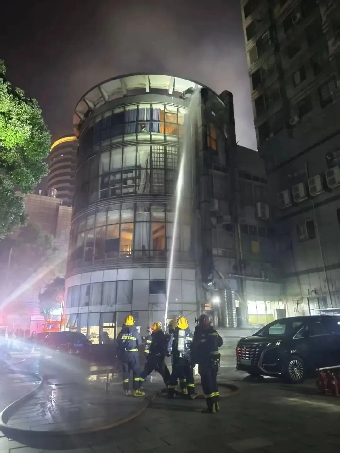 一组架设高压水枪压制顶部明火