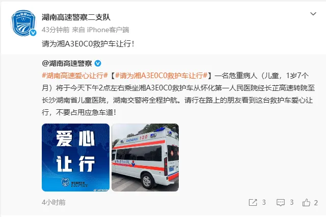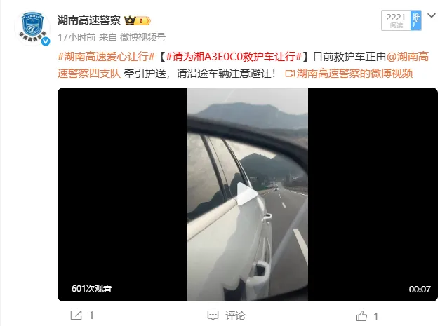 同时@湖南交警 @湖南高速警察 同步在微博平台设置话题,联动各支队微博转发呼吁沿途驾驶人主动让行。