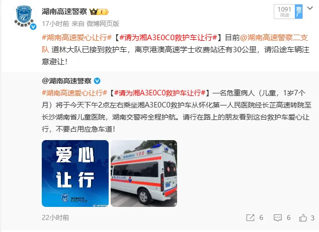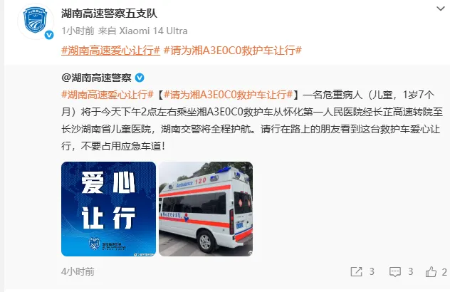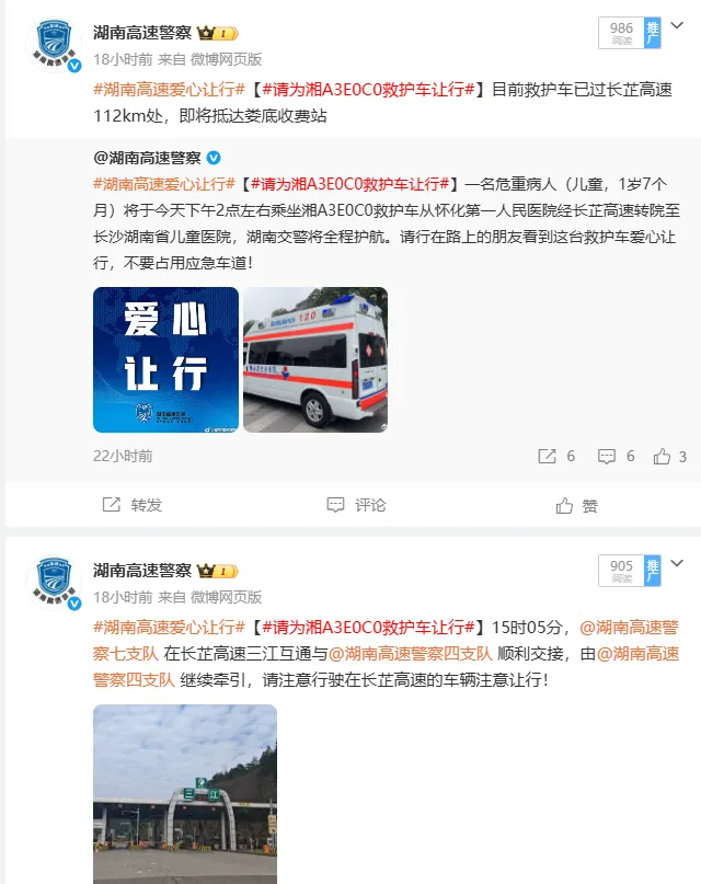期间,@湖南交警 在春运路况直播中实时转播了护送情况,@湖南高速警察 微博同步更新救护车行程。我们也要感谢沿途爱心让行的驾驶人朋友,因为有你们的配合,才让小宝宝能够快速顺利的转院,为救治赢得宝贵的时间!