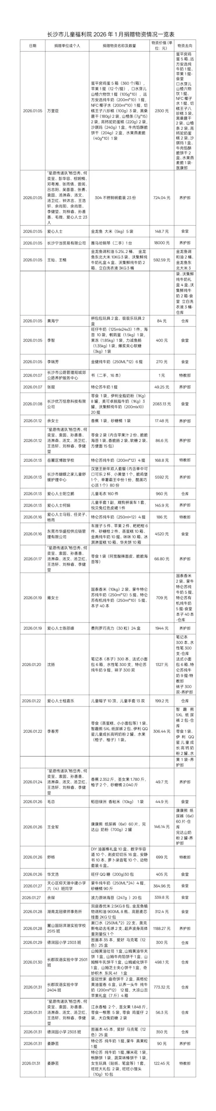 长沙市儿童福利院2026年1月捐赠公示