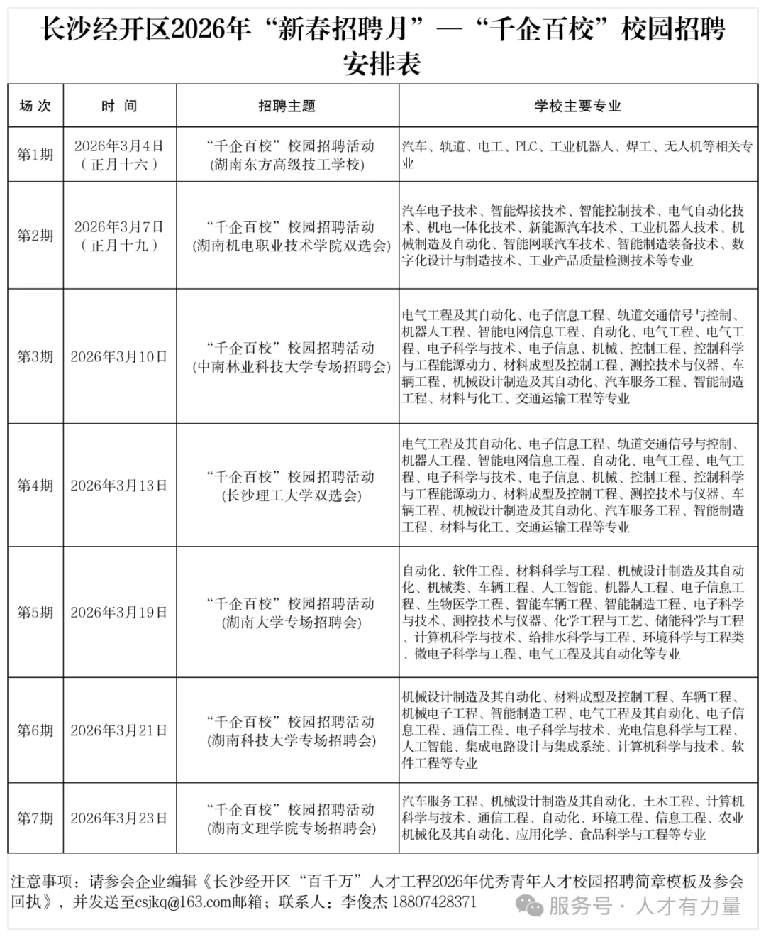 自2月24日(正月初八)至3月28日,30期“新春招聘月”活动精彩上线,招聘布局多点开花、精准匹配供需:12期“才聚星沙”区人才市场招聘涵盖“逢8”综合招聘、产业链招聘、产业园招聘、名企专场等特色场次;6期“春风送岗”招聘暖心奔赴基层;5期招聘落地湖南省人才市场;7期“千企百校”校园招聘走进高校,广揽青年英才。