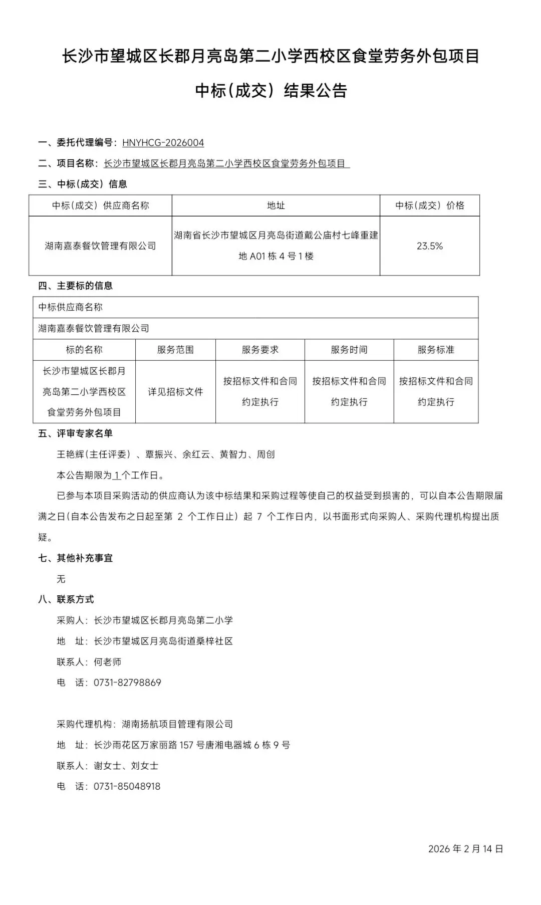 长沙市望城区长郡月亮岛第二小学西校区食堂劳务外包项目中标(成交)结果公告