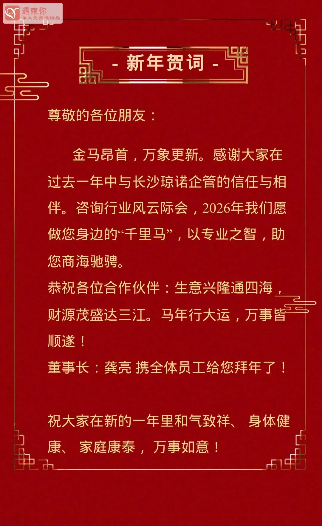 新岁启封,骏马奔腾。2026年,长沙琼诺将继续以专业为本、以诚信为基,策马扬鞭、笃行致远,用心做好服务,用情连接彼此,用行动回馈每一份信赖。