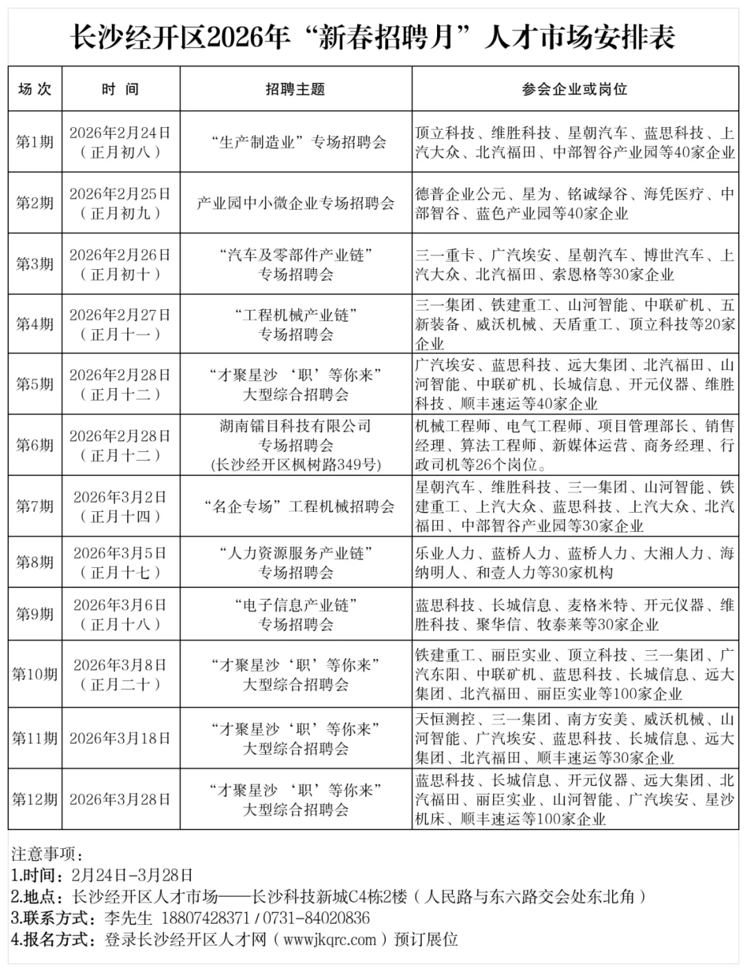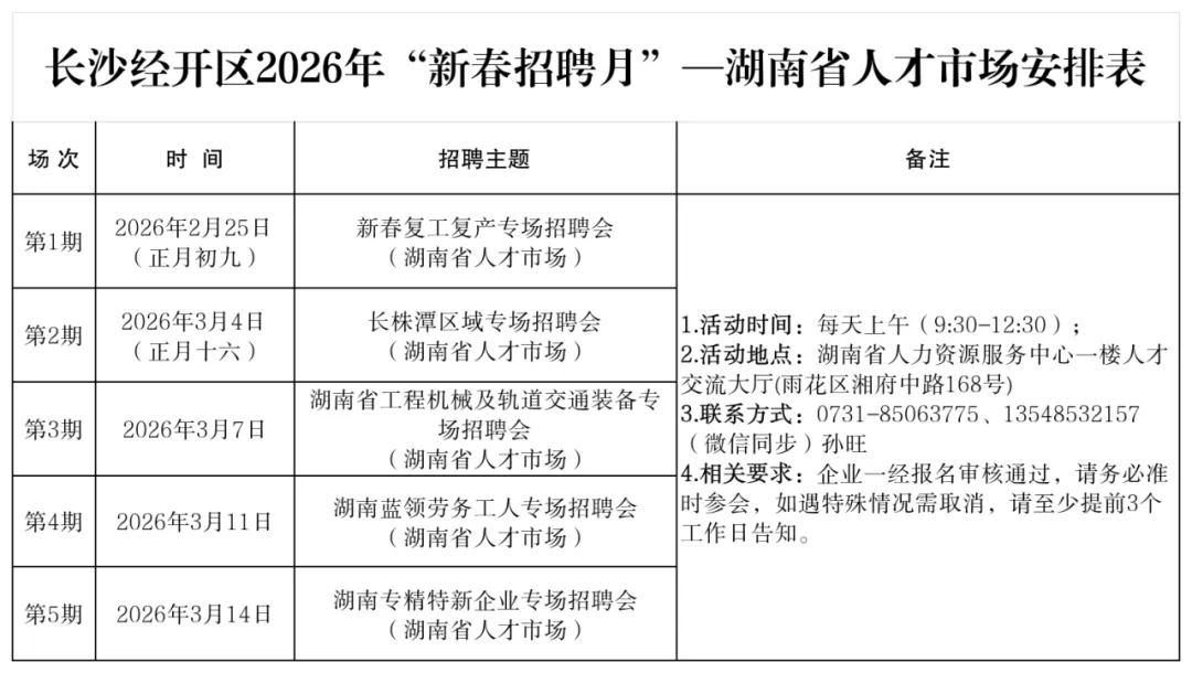 自2月24日(正月初八)至3月28日,30期“新春招聘月”活动精彩上线,招聘布局多点开花、精准匹配供需:12期“才聚星沙”区人才市场招聘涵盖“逢8”综合招聘、产业链招聘、产业园招聘、名企专场等特色场次;6期“春风送岗”招聘暖心奔赴基层;5期招聘落地湖南省人才市场;7期“千企百校”校园招聘走进高校,广揽青年英才。