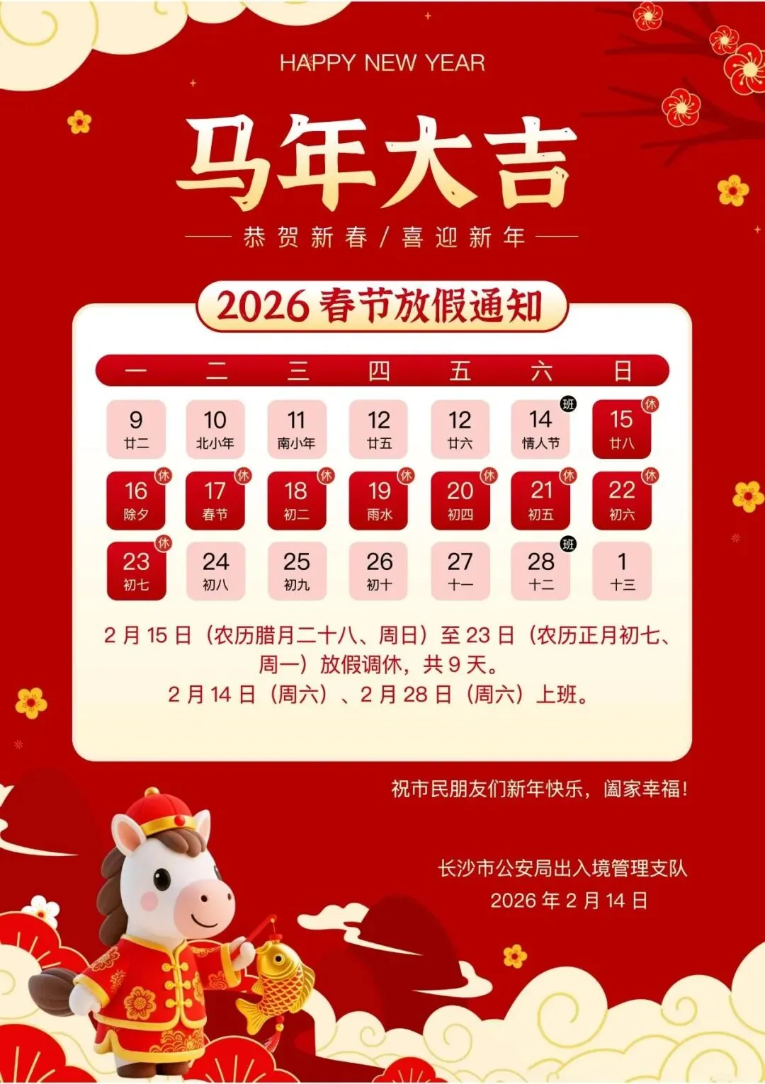 根据国家法定假期安排,2月15日至2月23日为2026年春节假期,全市公安出入境窗口暂停对外接待,长沙市公安局出入境接待大厅 24 小时自助服务厅正常运行。如您有法定事由紧急办证需求请及时与我们联系。请提前拨打电话告知急办事由,将有专人对接后续办证事宜。