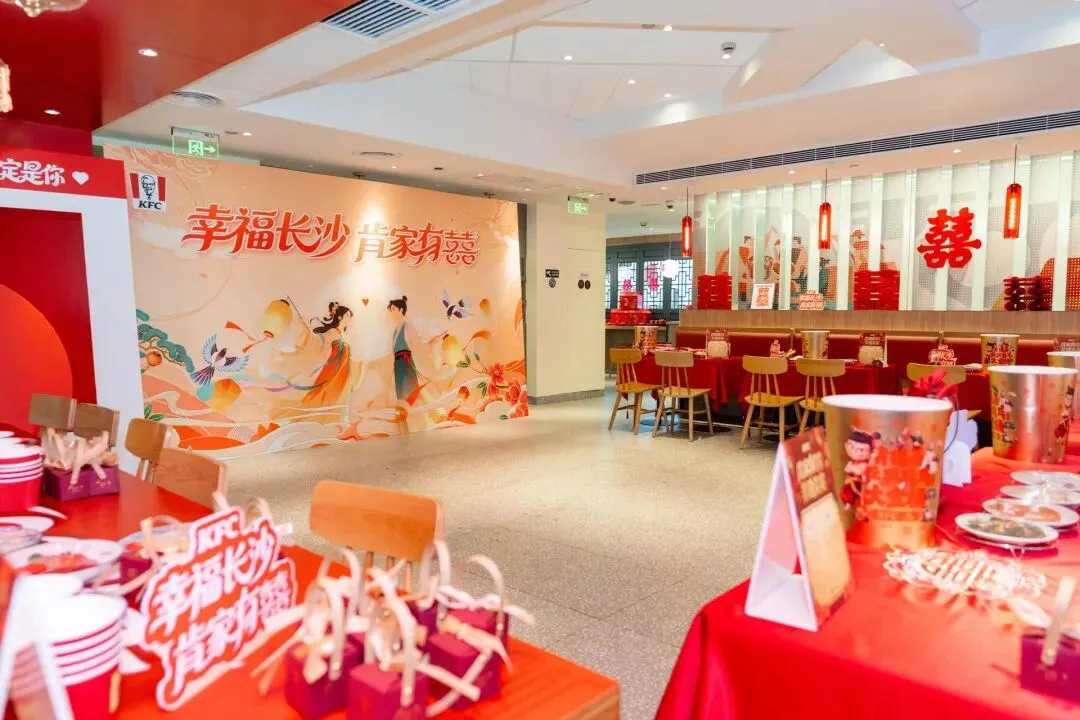 2026年2月14日,长沙洋湖水街肯德基餐厅二楼张灯结彩、暖意盎然。一场以“甜蜜长沙,肯家有喜”为核心主题的湖湘特色非遗喜宴温情启幕,活动以“餐饮为载体、婚俗为内核、浪漫为底色、非遗为特色”的创新模式,深度践行《长沙市“甜蜜经济”高质量发展三年行动计划》,为长沙“幸福长沙 甜蜜出彩”城市品牌注入鲜活文化活力与浪漫暖意。