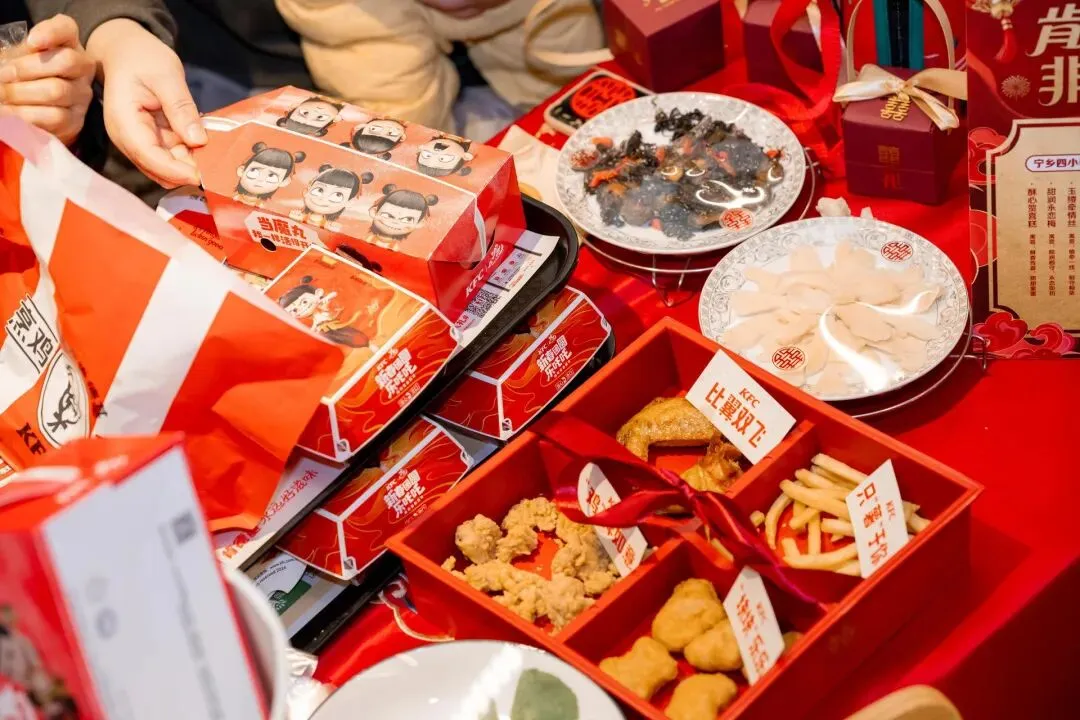 本次非遗喜宴的美食环节亮点十足,创新打造“肯德基大金桶+宁乡非遗美食四小碟”的特色组合,让西式经典美味与湖湘本土非遗风味碰撞出别样火花,为现场嘉宾带来全新的味蕾体验。经典肯德基金桶以熟悉的美味勾勒出喜宴的甜蜜底色,寓意团圆美满;宁乡非遗美食四小碟则尽显湖湘本土烟火气,地道非遗手艺造就原汁原味的宁乡特色,二者搭配相得益彰,中西融合的创意巧思,让喜宴美味更具层次感、更富地域特色。据悉,宁乡非遗美食四小碟是长沙市级非遗项目,源于清代,由砂仁糕、刀豆花、冰姜、紫苏梅四款经典小吃组成,分别以松酥、爽口、驱寒、酸甜的独特口感,承载着湖湘本土的乡愁与非遗底蕴,均由非遗传承人遵循古法匠心烹制而成。