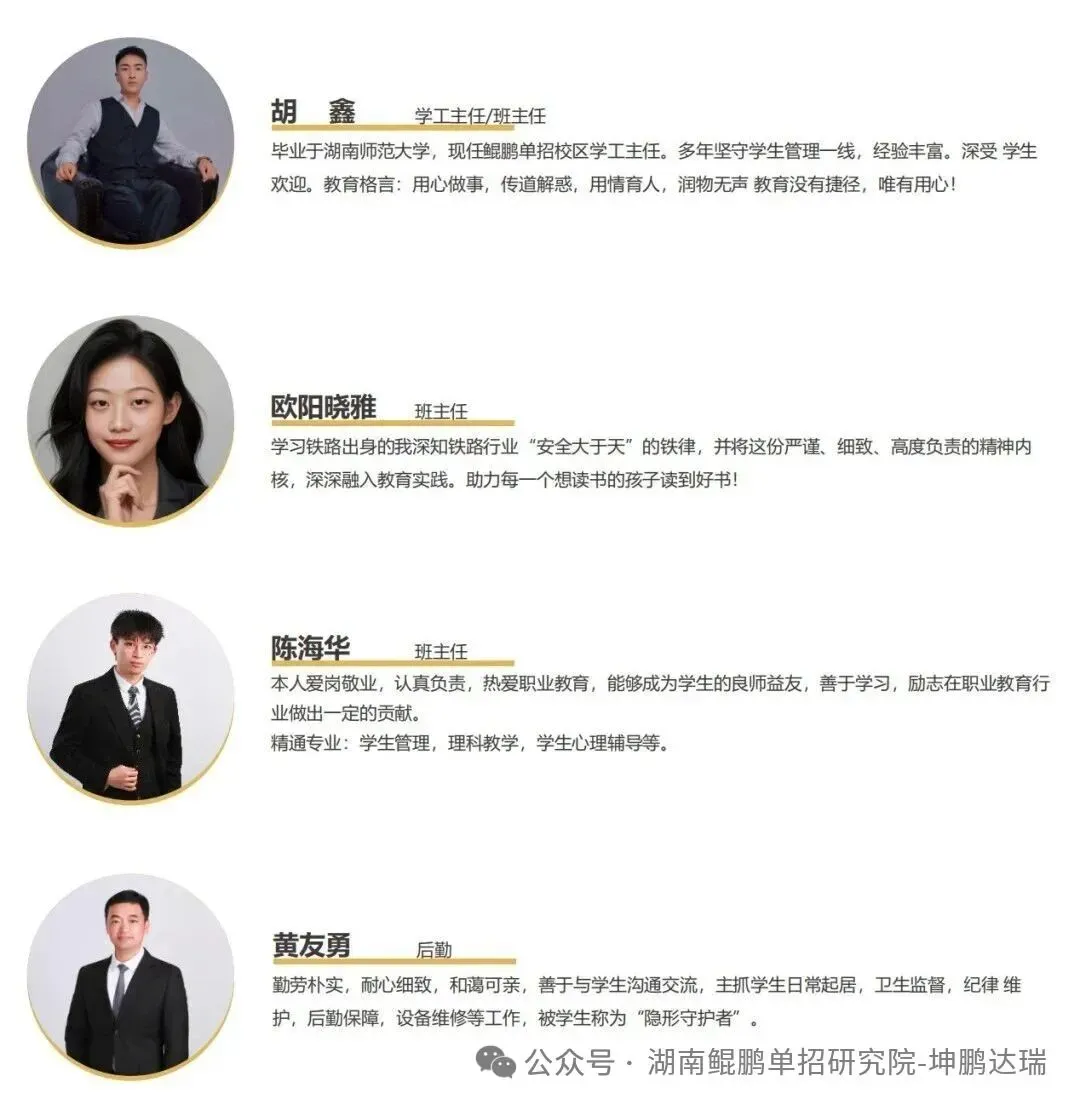 鲲鹏单招为梦启航湖南⻰骧交通学校鲲鹏单招集训营凭借优秀的师资团队和丰富的职业升学教学经验,以学⽣为中⼼,秉持“对每⼀位学⽣都负责任”的教育宗旨,采⽤精品⼩班授课模式,配备专⻔的班主任进⾏⽇常管理,根据考纲编写最新内部教材,规范严谨教学,⼀对⼀志愿填报,迅速成⻓为星城⻓沙⾼职单招升学培训教育领域⾥异军突起的新星。鲲鹏铁路单招集训营本着“明德励 学,学为实⽤,服务铁路”教育理念,针对铁路单招⾼职升学考试特点,量⾝打造铁路单招⾼职⾼考升学备考冲刺⽅案,实⾏专家督导,名师执教,⼩班教学,专职班主任全程跟踪封闭式、半军事化管理。学校⾼度重视学⽣⽂化教育与职业素养教育,全⽅位助⼒学⽣“构筑铁路⼤学梦,落定就业铁饭碗”的⼈⽣奋⽃⽬标。