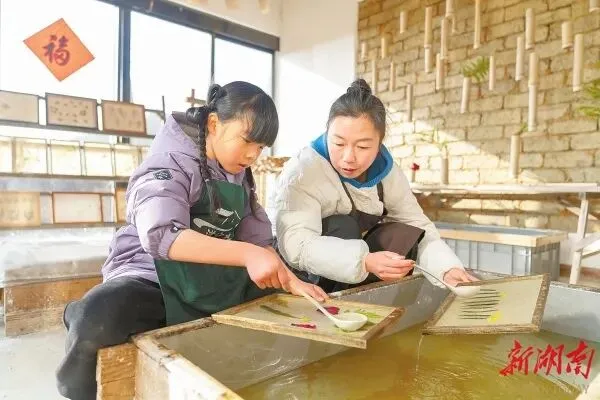 春节前夕,道官冲村民张兆媛(右)和女儿一起制作花草纸。