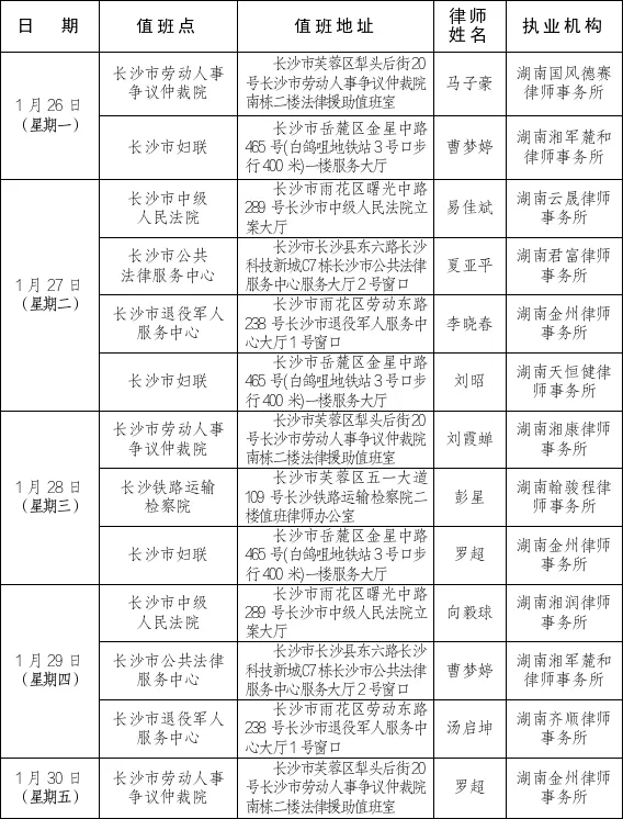 值班安排 | 长沙市法律援助中心驻点律师值班信息(1月26日-1月30日)
