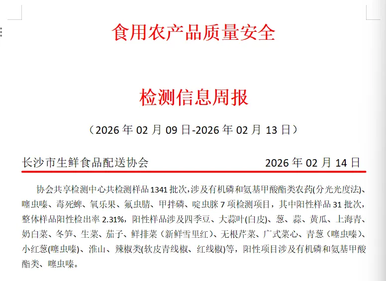 长沙市生鲜食品配送协会食用农产品质量安全检测信息|02月09-02月13日 周报