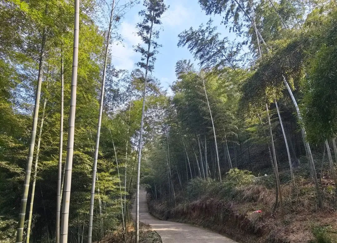穿过绵延竹海,来到山上的亭子,风景与山下截然不同,裸露的树干、枯黄的草与,才真切感觉到冬天的气息。沿着山脉没有规整的步道,却已被无数游客走出了一条路,正所谓“世上本没有路、走的人多了,也便成了路”。