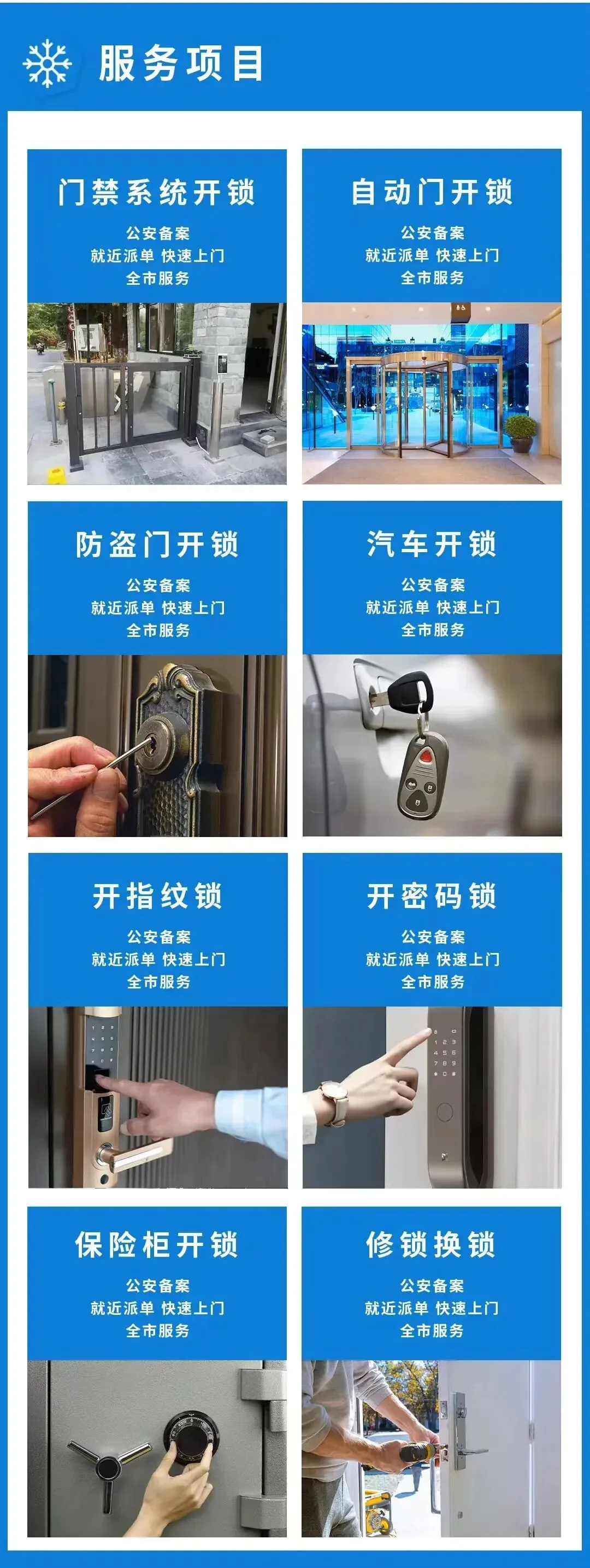 🔑 民用开锁:防盗门开锁、换锁芯、门锁维修🏢 商业开锁:办公室门锁、玻璃门锁、文件柜开锁🚗 汽车开锁:汽车开锁、配汽车钥匙、遥控匹配🔐 锁具升级:C级锁芯更换、智能锁安装调试🧰 应急服务:钥匙断锁内处理、夜间紧急开锁