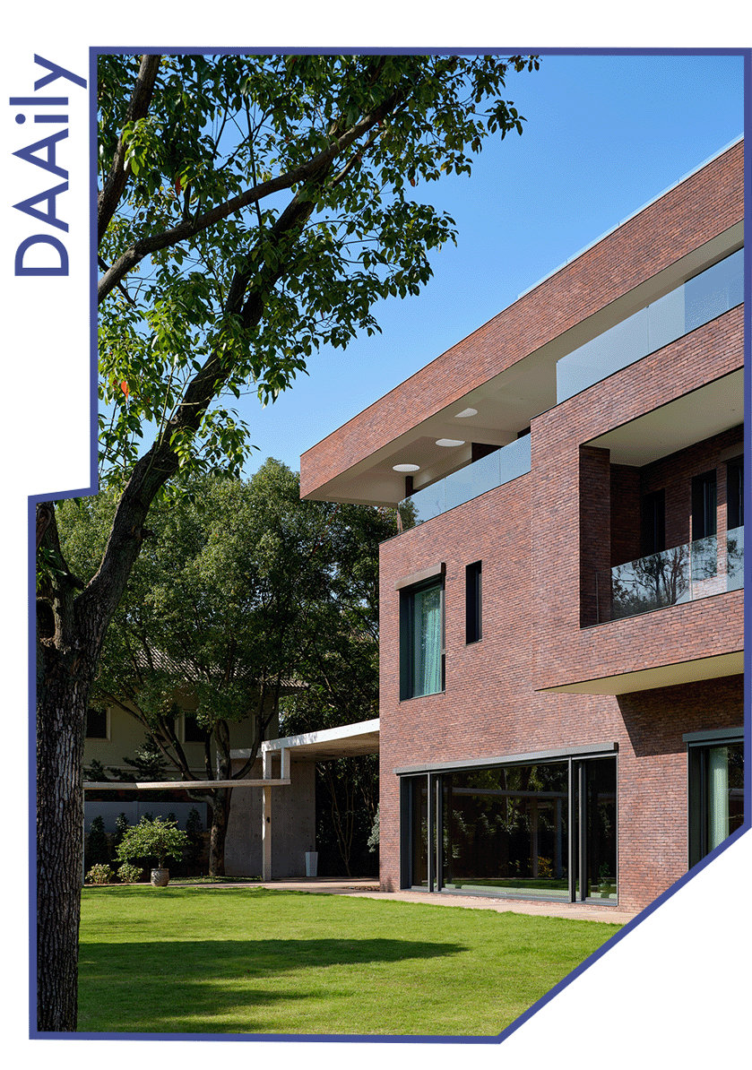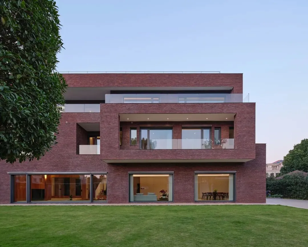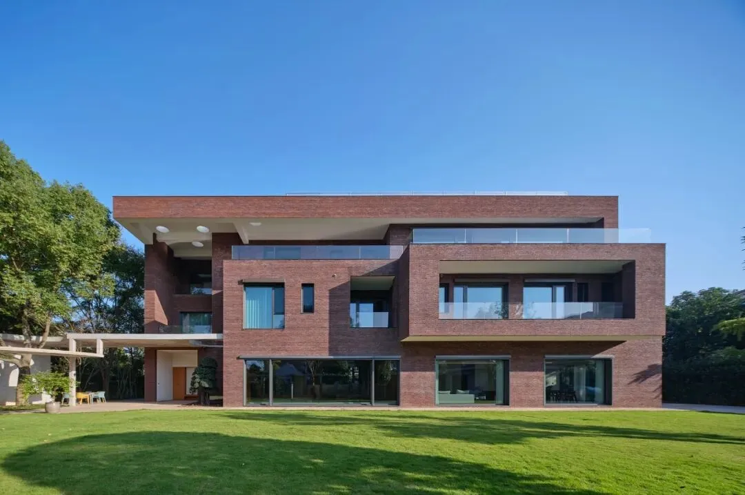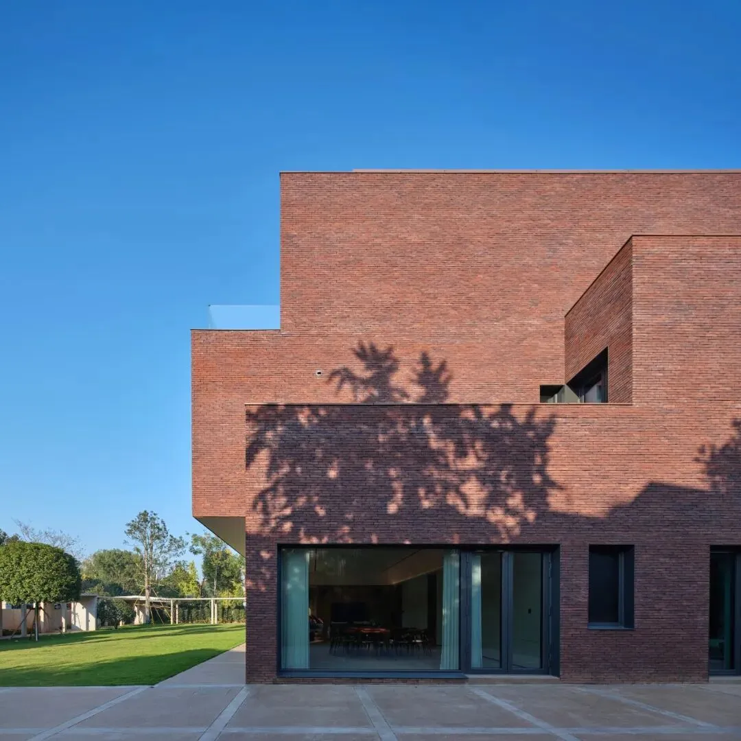 这一选择具有多重的意味:其一,砖是一种诚实、带有手工温度与时间质感的材料,它的色泽会随着风雨日光缓慢变化,与自然共同呼吸,这与追求瞬时视觉刺激的装饰性格格不入。其二,在周围多是光滑面材的别墅群中,红砖的质朴与稳重,赋予建筑一种沉静的“在地性”,它不张扬,却以自带的温暖、质感与时间感赋予建筑沉静的重量,与周遭的绿意建立了一种柔和而持久的对话。