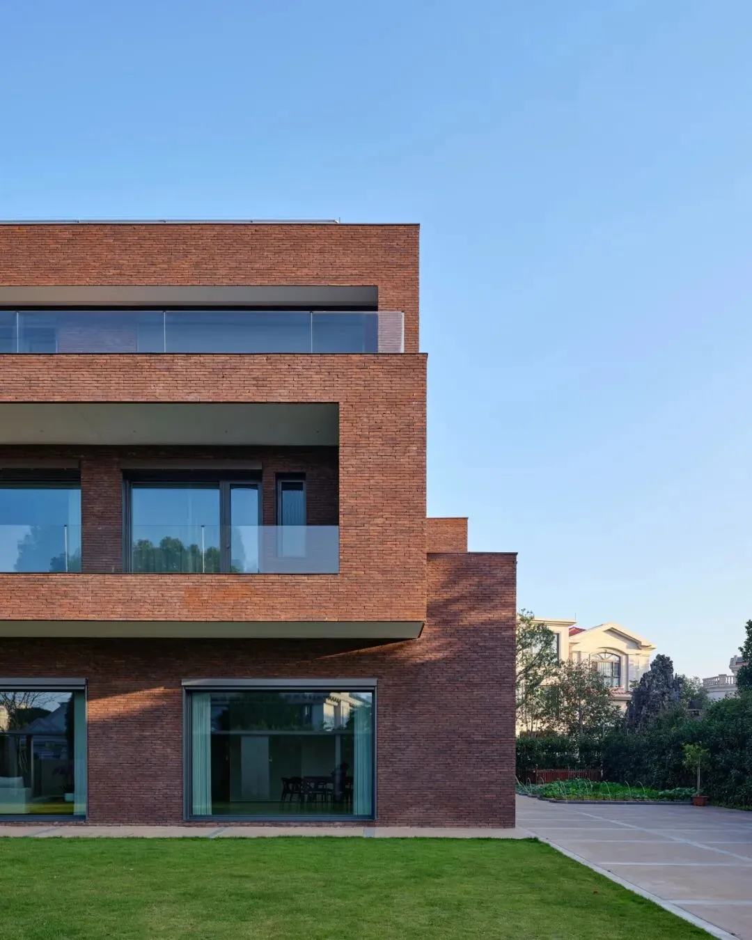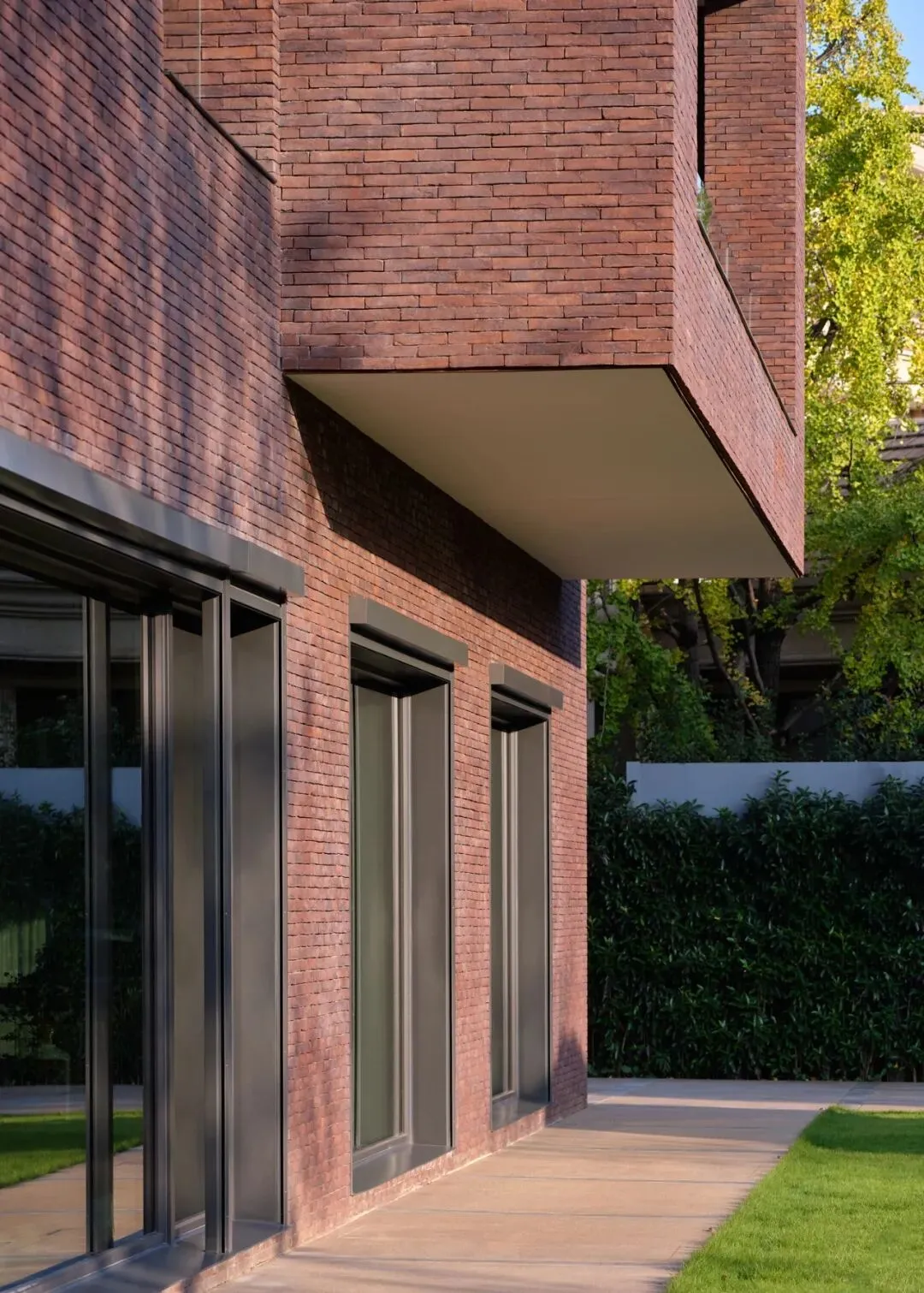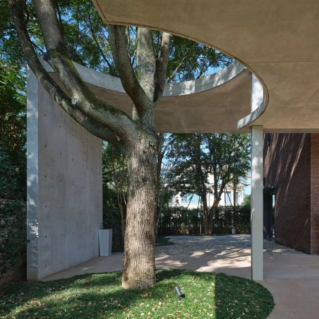 这一选择具有多重的意味:其一,砖是一种诚实、带有手工温度与时间质感的材料,它的色泽会随着风雨日光缓慢变化,与自然共同呼吸,这与追求瞬时视觉刺激的装饰性格格不入。其二,在周围多是光滑面材的别墅群中,红砖的质朴与稳重,赋予建筑一种沉静的“在地性”,它不张扬,却以自带的温暖、质感与时间感赋予建筑沉静的重量,与周遭的绿意建立了一种柔和而持久的对话。