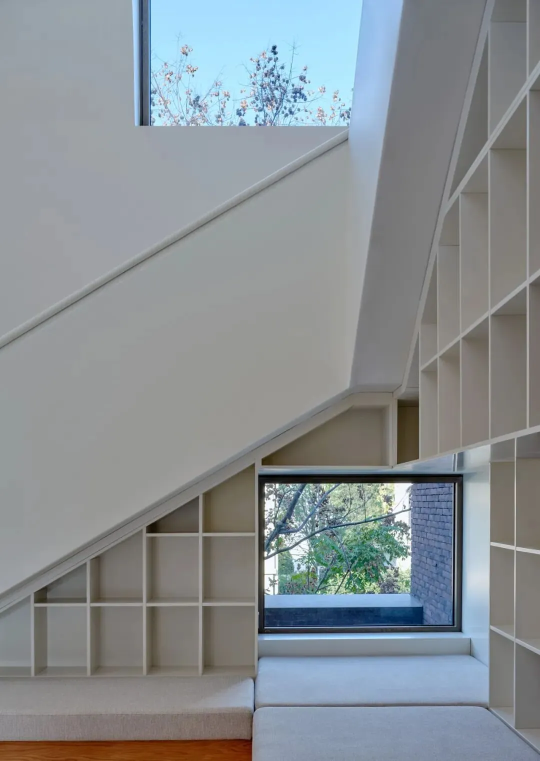 最巧妙的一处,是儿童区走道尽端的竖向窄窗,它别无他物,只“借”来东邻院落的一角绿荫,成为走廊尽头永恒的、充满生机的端景。这些窗,是“借景”艺术的当代演绎。它们不仅将风景引入,更通过精心的构图,赋予寻常景物以画的意蕴。同时,建筑通透的界面也让内部生活的场景隐约透出,与庭院、树木形成一种“看与被看”的互动,建筑本身也成为了环境中的一景。
