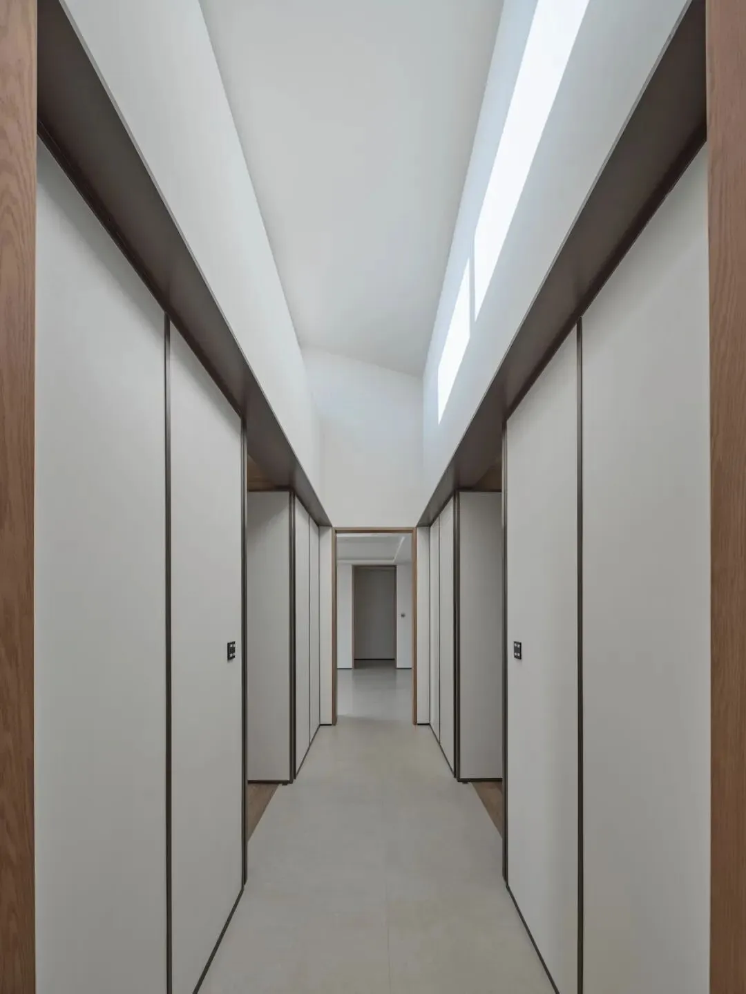 光,是这立体园林中最富诗意的“漫游者”。第一缕天光从屋顶斜射入儿童活动区的挑空,随时间在墙面与地板上缓缓“行走”,像一只无声的日晷;第二束天光,则精确地落入主卧的衣帽间;第三到光柔和得进入浴室与主卧之间的走道上,将日常的起居洗漱,点化为一场与光影的私密对话。这便是在路斯“内部满足”框架下,对情感与氛围的极致追求。