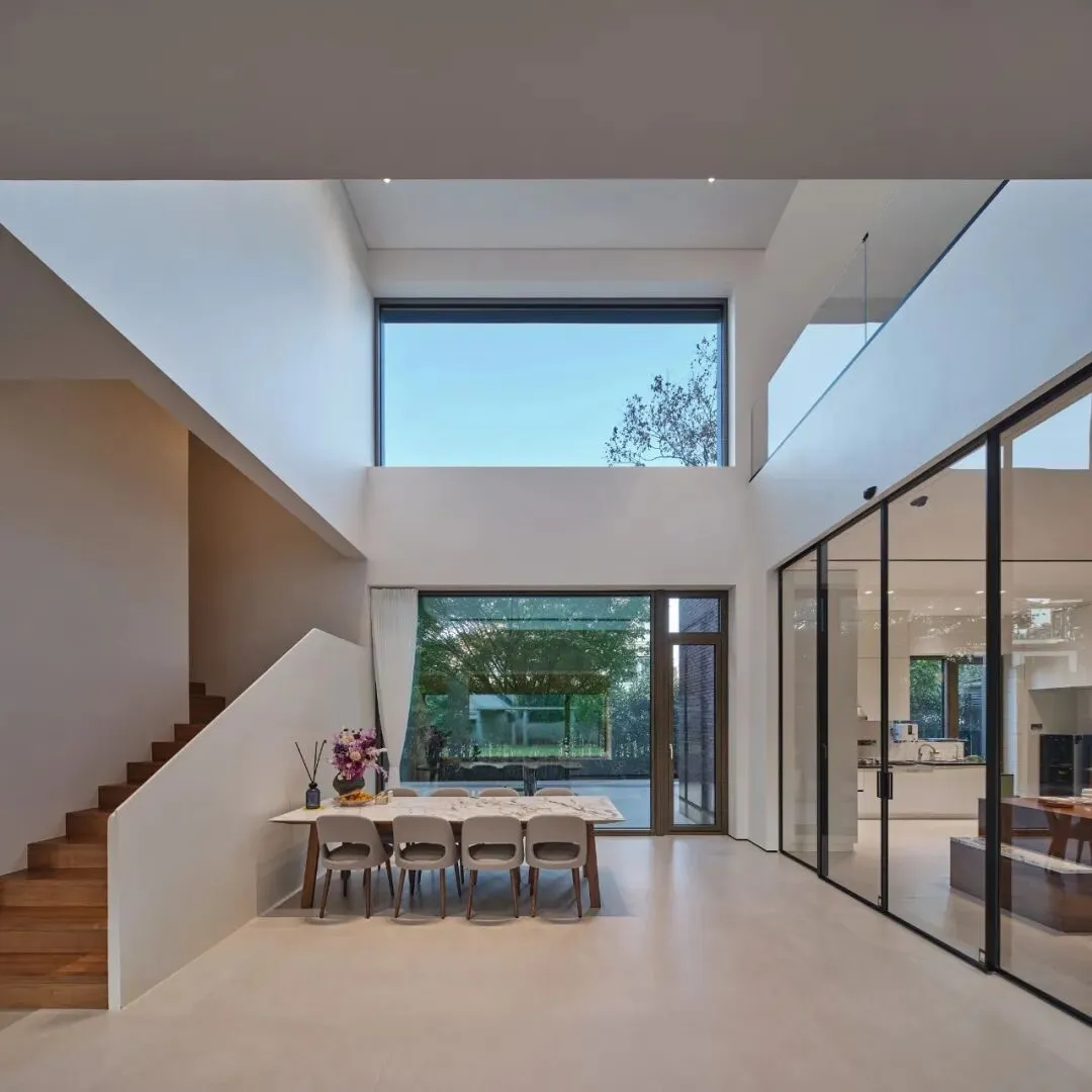 建筑与外部世界的对话,通过一系列如画框般“精确计算”的开窗来完成。客厅的水平长窗,将草坪绿意定格为生活的全景背景;餐厅的方窗,专门对准北庭院中的一株鸡爪槭,框取一幅四季变幻的立轴画;健身房朝西的水平长条窗,则框取那棵香樟的树影入内。