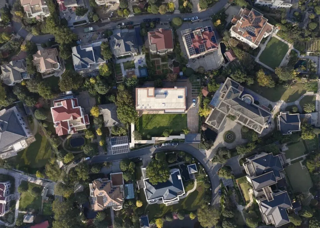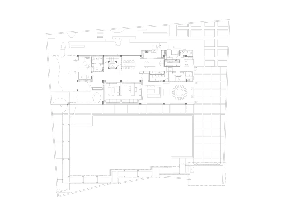 项目始于一次决绝的告别:业主在找到我们前两年便推倒了场地上一栋欧陆风旧宅,这一行为本身即是对无根形式与消费符号的摒弃。我们面对的,是一片清空的场地、一个严格沿用旧宅红线的轮廓限定,以及几棵原地生长的树木。这一轮廓限定定义了创作的边界。在约 2000 平方米的限定范围内,我们的首要策略是“让”与“留”:以紧凑姿态将风雨廊与宅院入口贴边布置,从而在用地中央“让”出开阔草坪,为家庭生活预留活动场地。