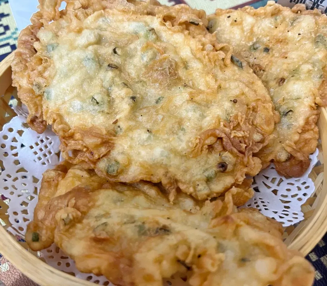 招牌锅贴,炸得酥脆的灰面粑粑,口感非常好,连我这个不吃葱的人,都忍不住要把没葱的边边都吃了,哈哈。