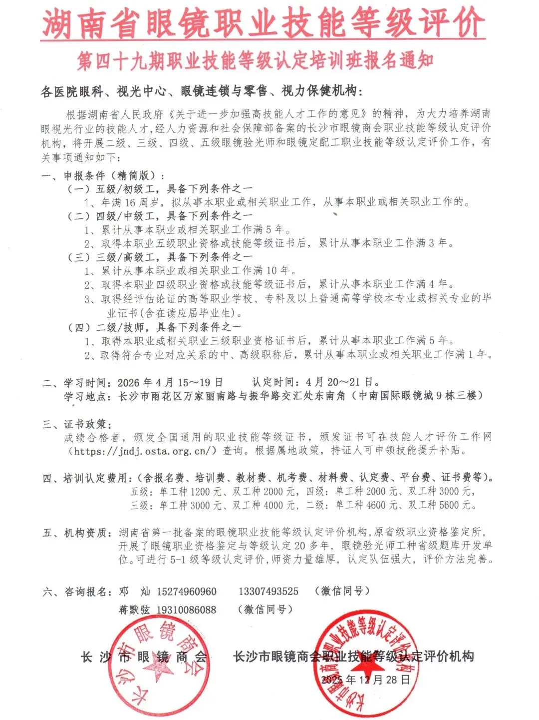 根据湖南省人民政府《关于进一步加强高技能人才工作的意见》的精神,为大力培养湖南眼视光行业的技能人才,经人力资源和社会保障部备案的长沙市眼镜商会职业技能等级认定评价机构,将开展二级、三级、四级、五级眼镜验光师和眼镜定配工职业技能等级认定评价工作,有关事项通知如下:
