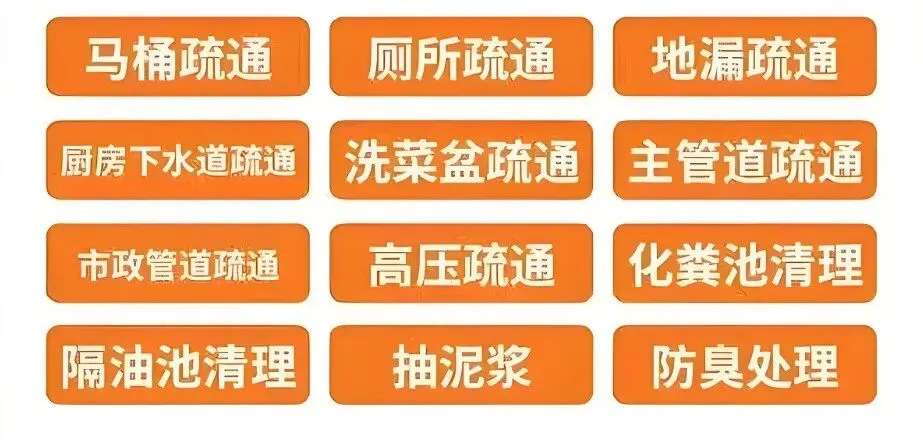 | 🚽 管道疏通 | 使用专业设备,解决各类下水道、卫生间、地漏、浴缸、菜池、马桶、蹲坑等堵塞 |