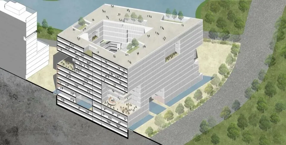 如果坚实的体量是建筑对外的“定”,那么体量上四角被精心切削出的巨大开口,则是建筑向城市发出的主动“邀请”。我们称这些开口为 “城市之窗”。它们绝非普通窗户的放大,而是建筑尺度上的一次战略性空间操作,是体量中有意识的“留白”。
