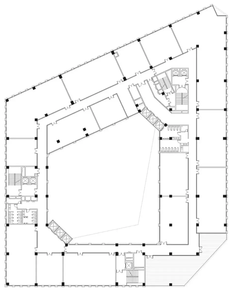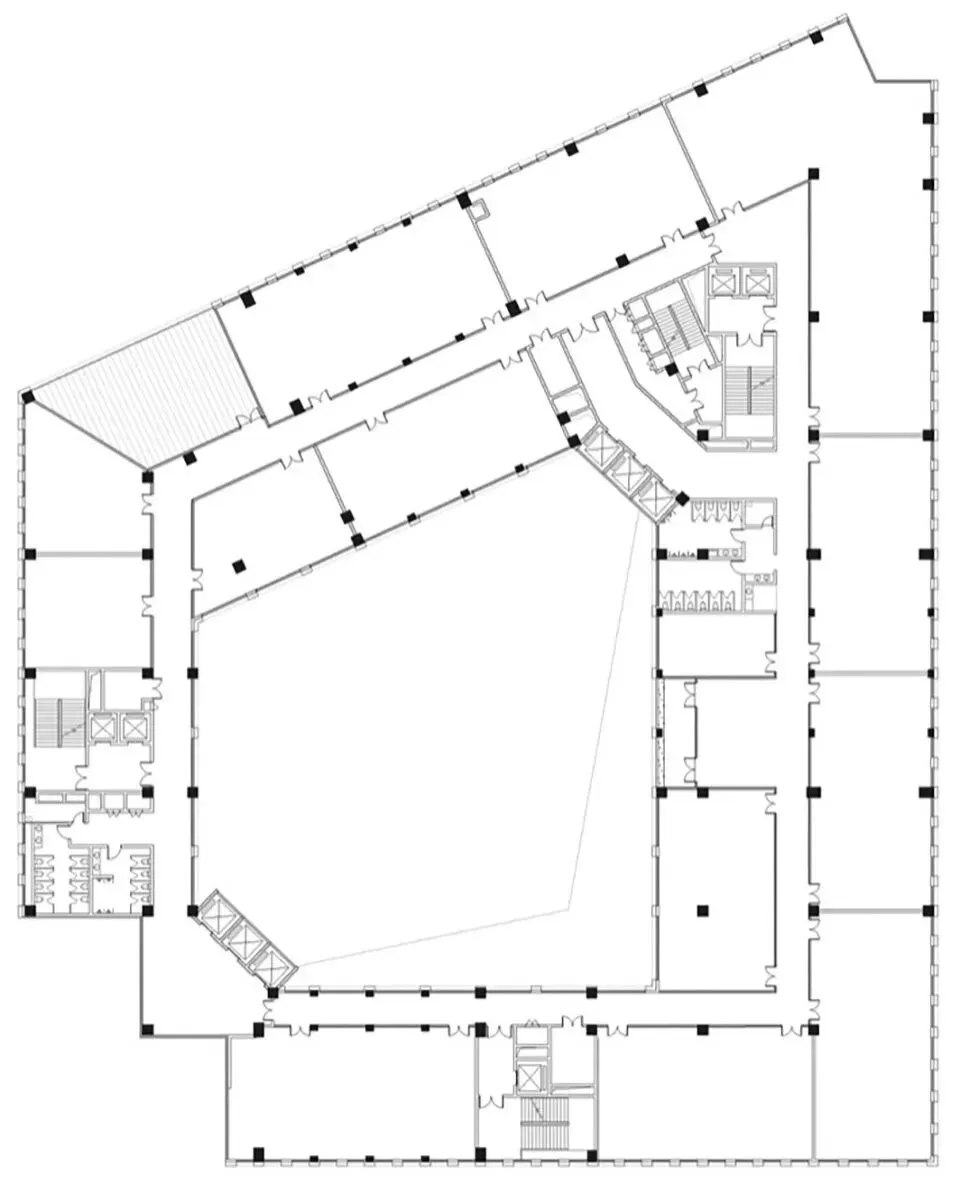 由于限高和容积率的需求。我们必须在紧贴红线、最大化利用场地,建筑呈现出一个坚实、完整的不等边四边体量。它没有选择碎片化或消隐的姿态,反而以一种纯粹的几何肯定性,沉稳地锚固在街角。在周边尺度巨大却往往形式失语的工业建筑群中,这种完整性与体量感,本身即成为一种沉静的宣言。它不再是一个背景,而是一个具有强大存在感的基准点,一个能让城市目光得以聚焦的“物”。这并非为了纪念性的宏大,而是为了在纷杂的肌理中,提供一种清晰可辨的场所坐标。