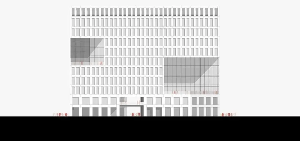 星沙产业基地自贸总部大楼以“巨构”的整合姿态回馈区域,以“景框”与城市的对话,以“院落”为核心滋养内在的活力,以“切削”与“退台”完成对场地与视线的具体关照。在五十米的高度限制下,它通过对水平方向延展、空间深度挖掘、视线精妙引导以及形体细节雕琢的综合经营,构建了一个丰富、立体且充满生机的微城市单元。