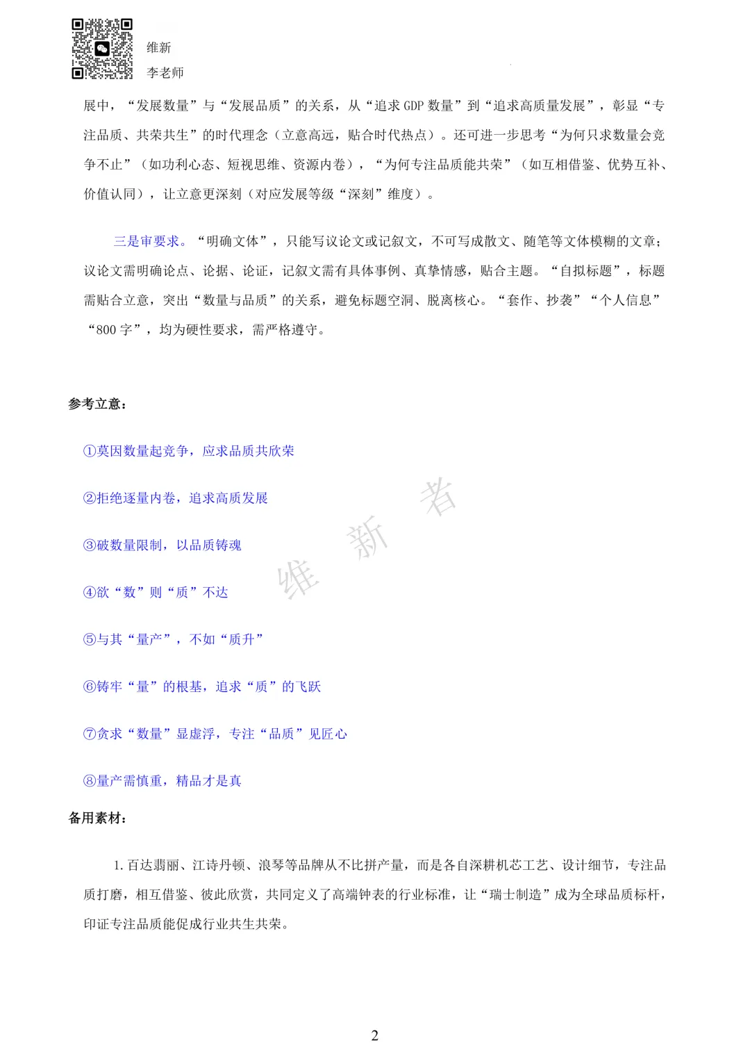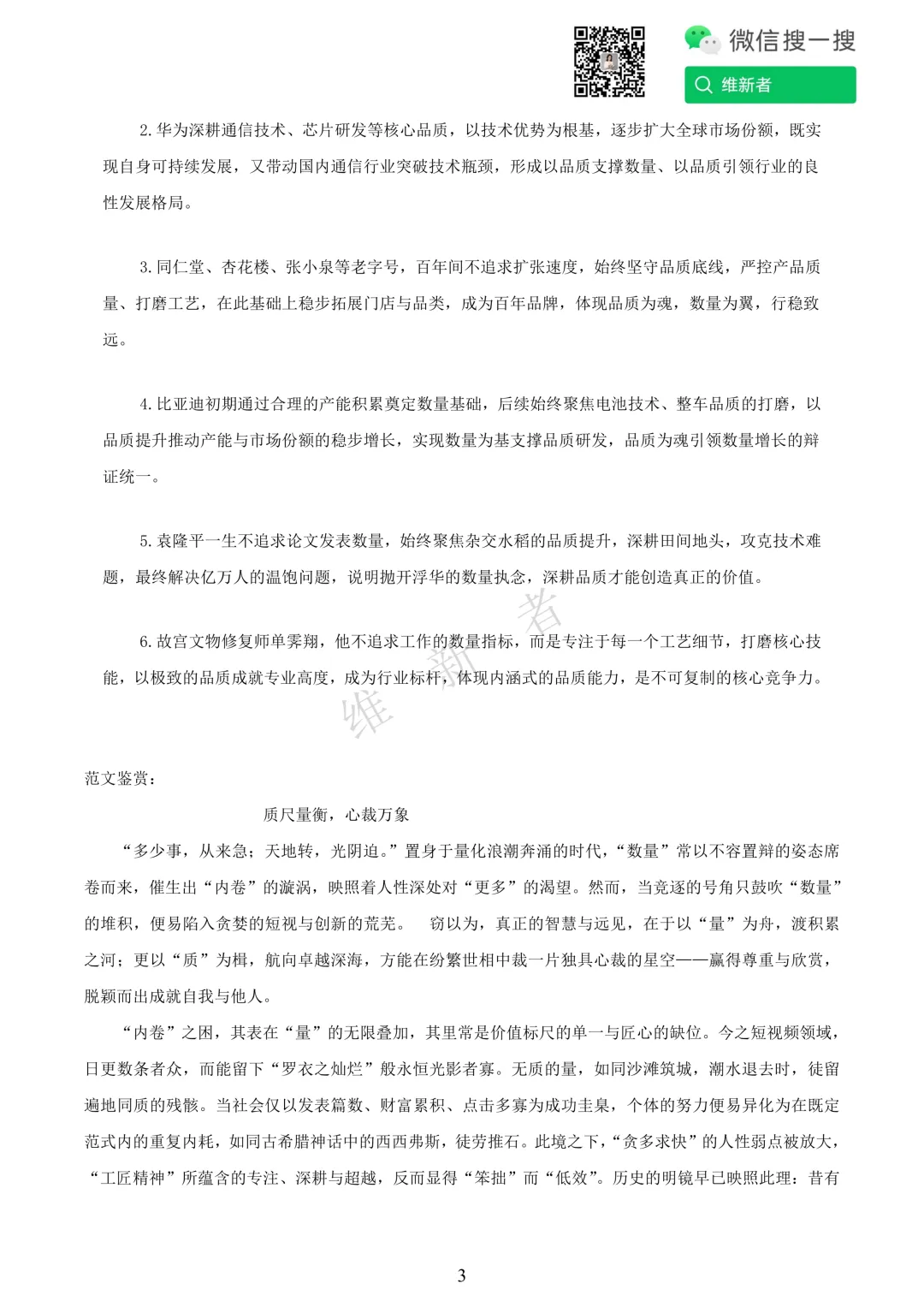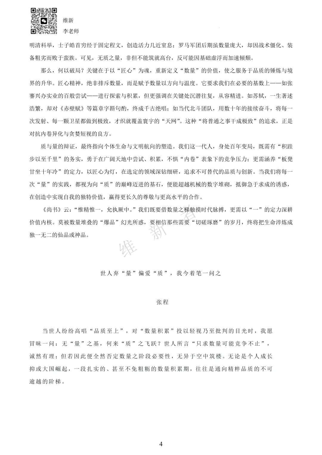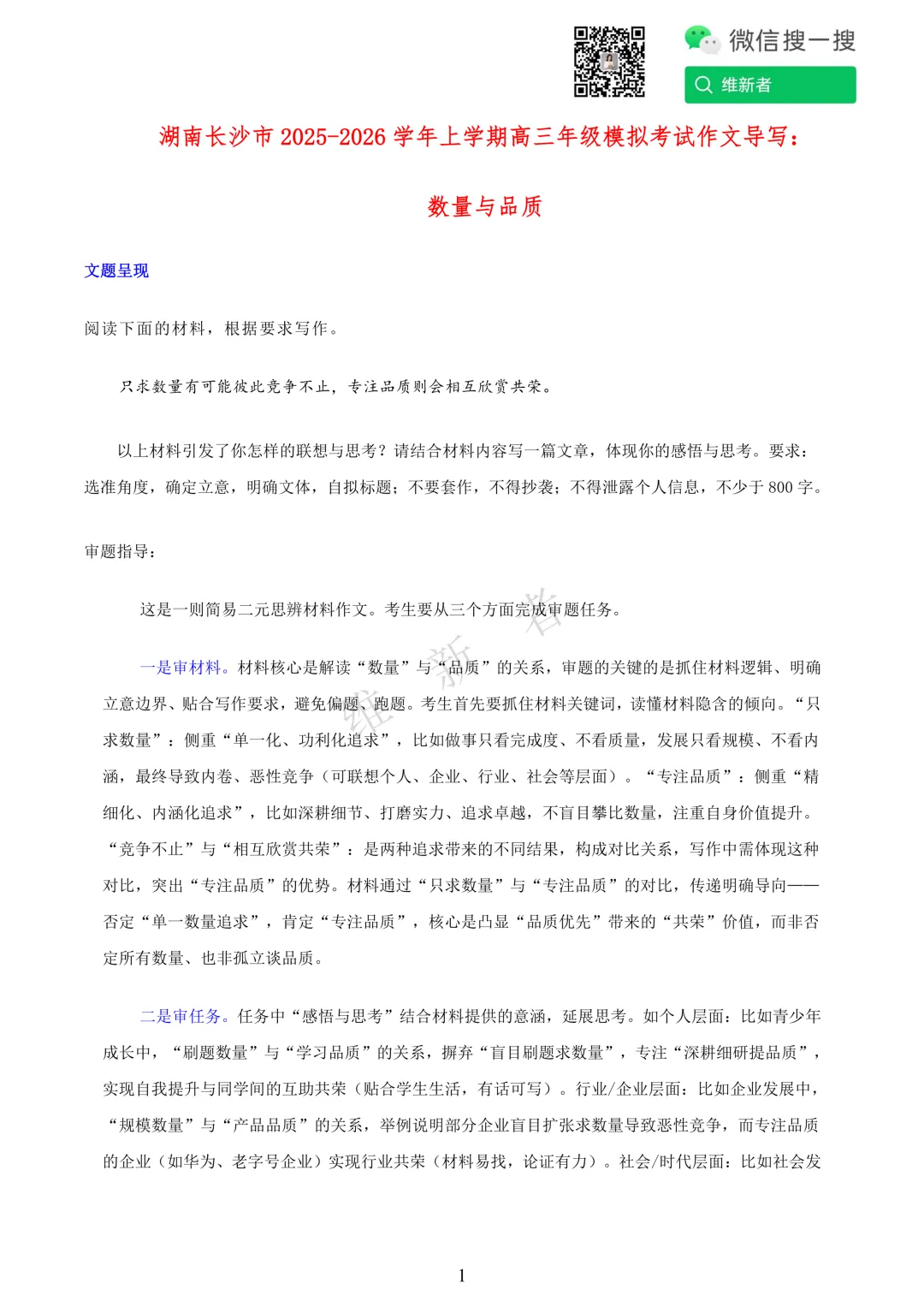 维新者致力于收集和整理各大名校试题,帮助您省心省力获取各类优质的试卷与教辅资源。我们这次带来的是湖南长沙市2025-2026学年上学期高三年级模拟考试作文导写:数量与品质,希望能够有助于您孩子的学习。