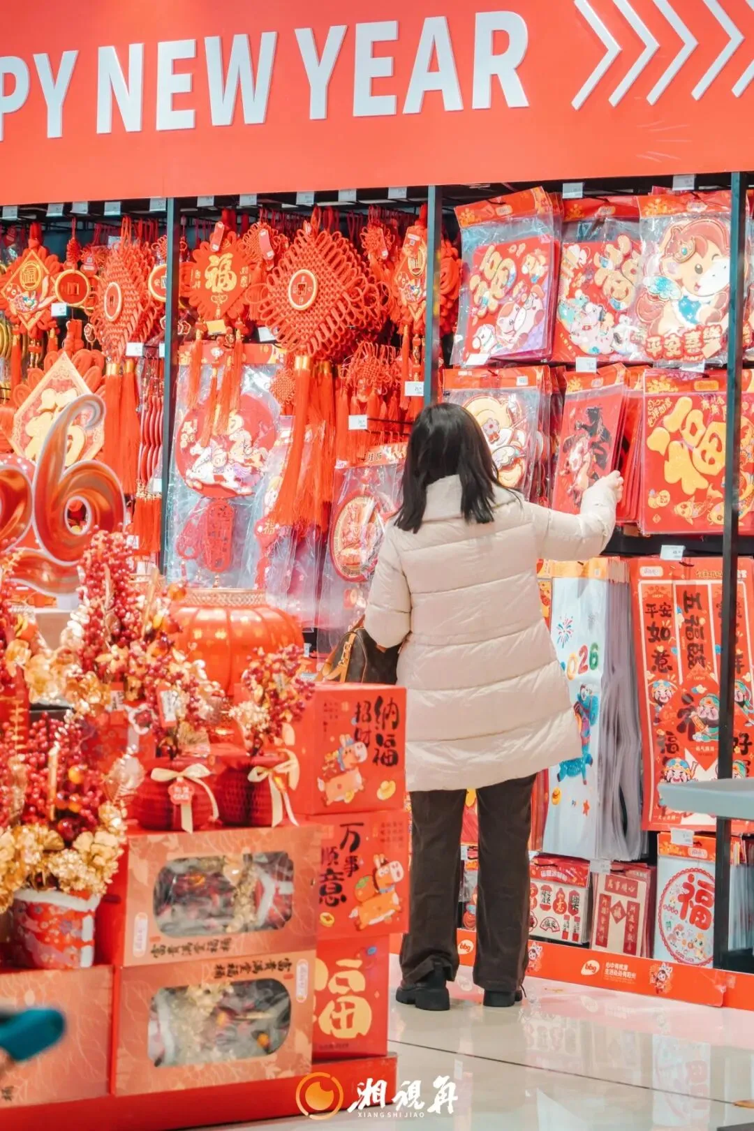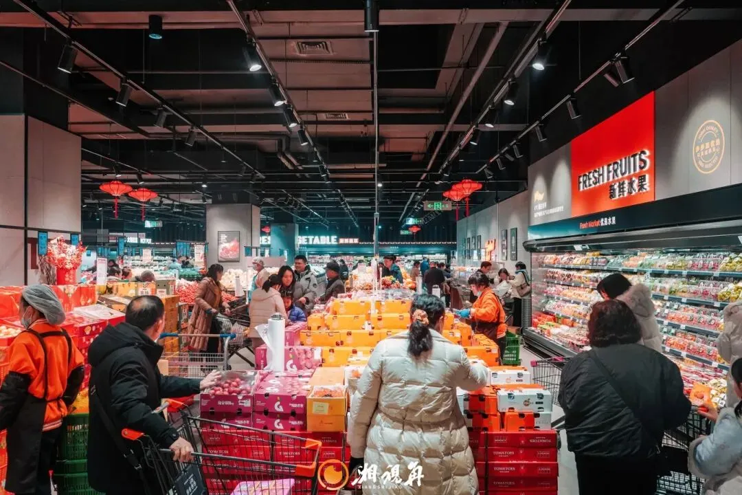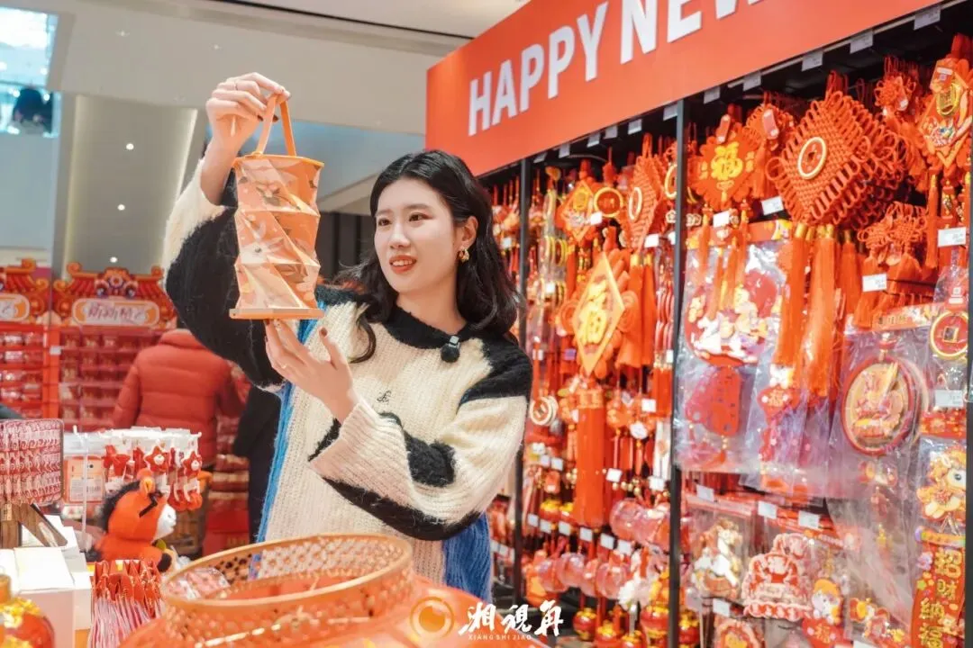 红灯笼、福字等装饰将年味直接拉满,货架上从湘味腊货、新鲜蔬果到糖果糕点、酒水饮料,陈列得满满当当,透着富足与喜庆。
