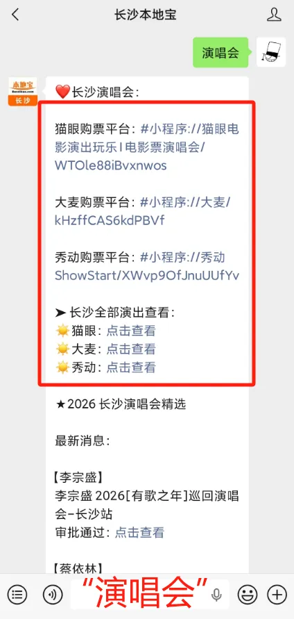 回复:演唱会,获取长沙近期演唱会汇总信息