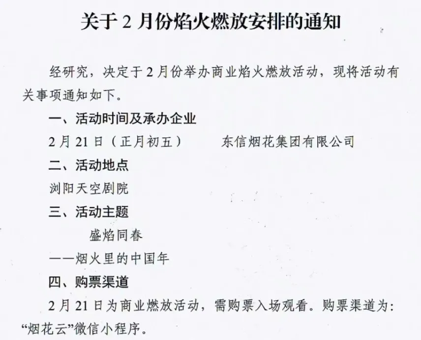 2月21日为商业燃放活动,需购票入场观看。购票渠道为:“烟花云”微信小程序。