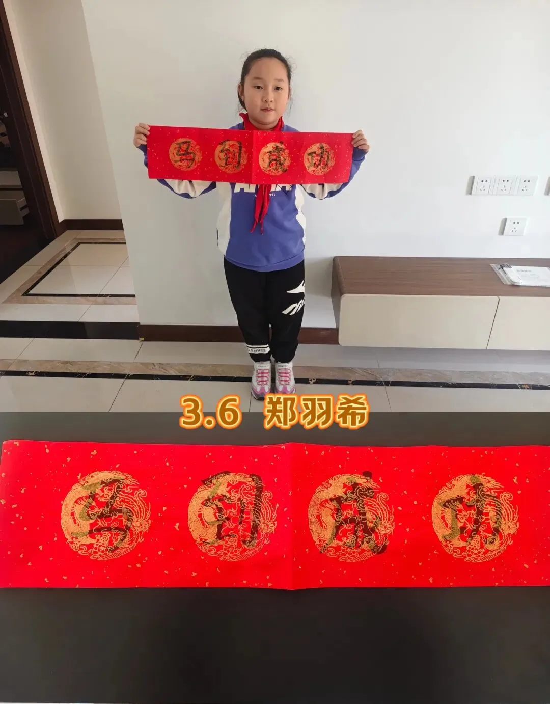 一张张手抄报,是孩子们对春节的“童画”解读:年的传说、年俗顺口溜、马年成语……一幅幅书法作品,虽显稚嫩,却墨香十足。三年级“小书法家”们铺开红纸,提笔写下“福”字和“龙马精神”的春联。一笔一画,都是对传统文化的致敬。